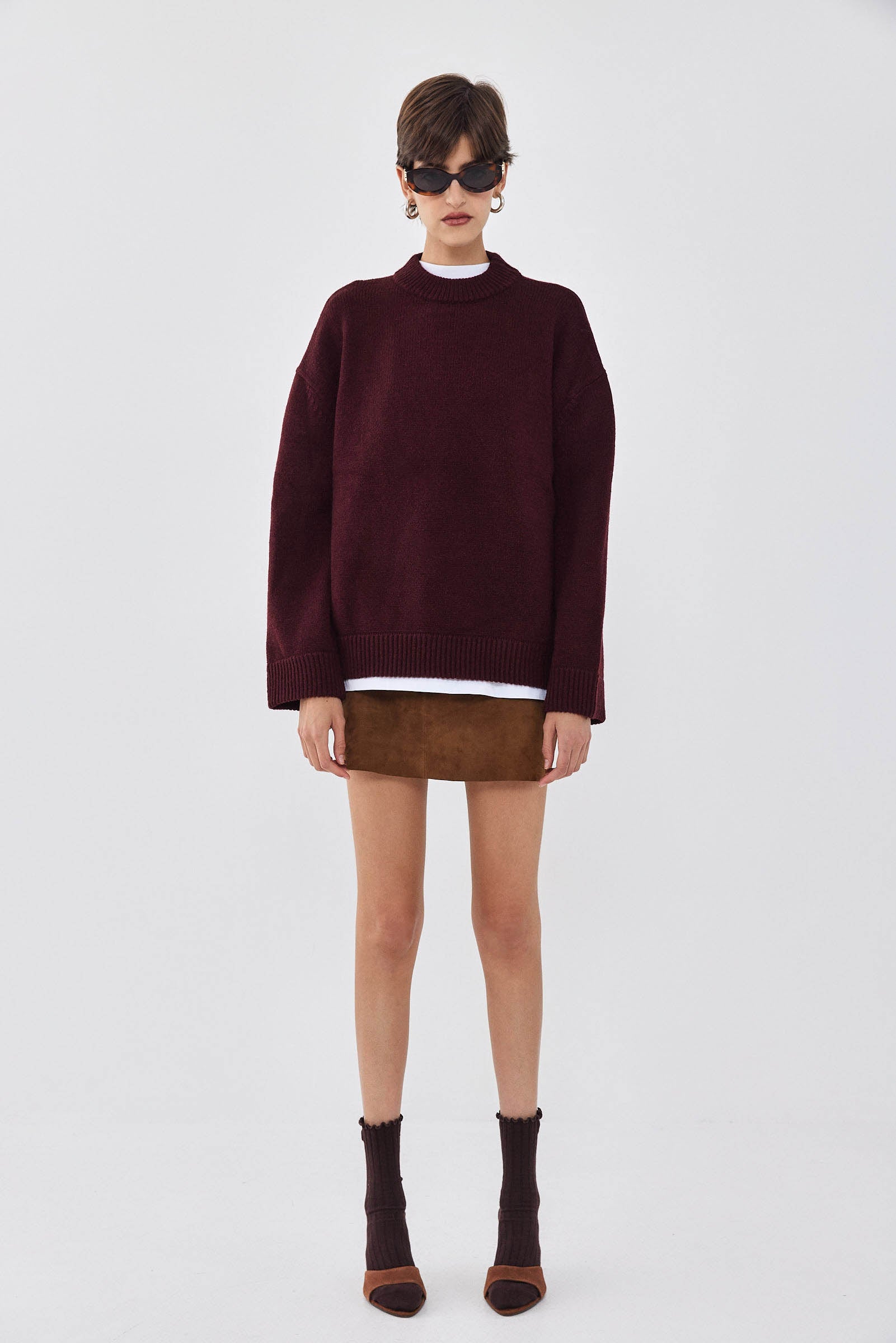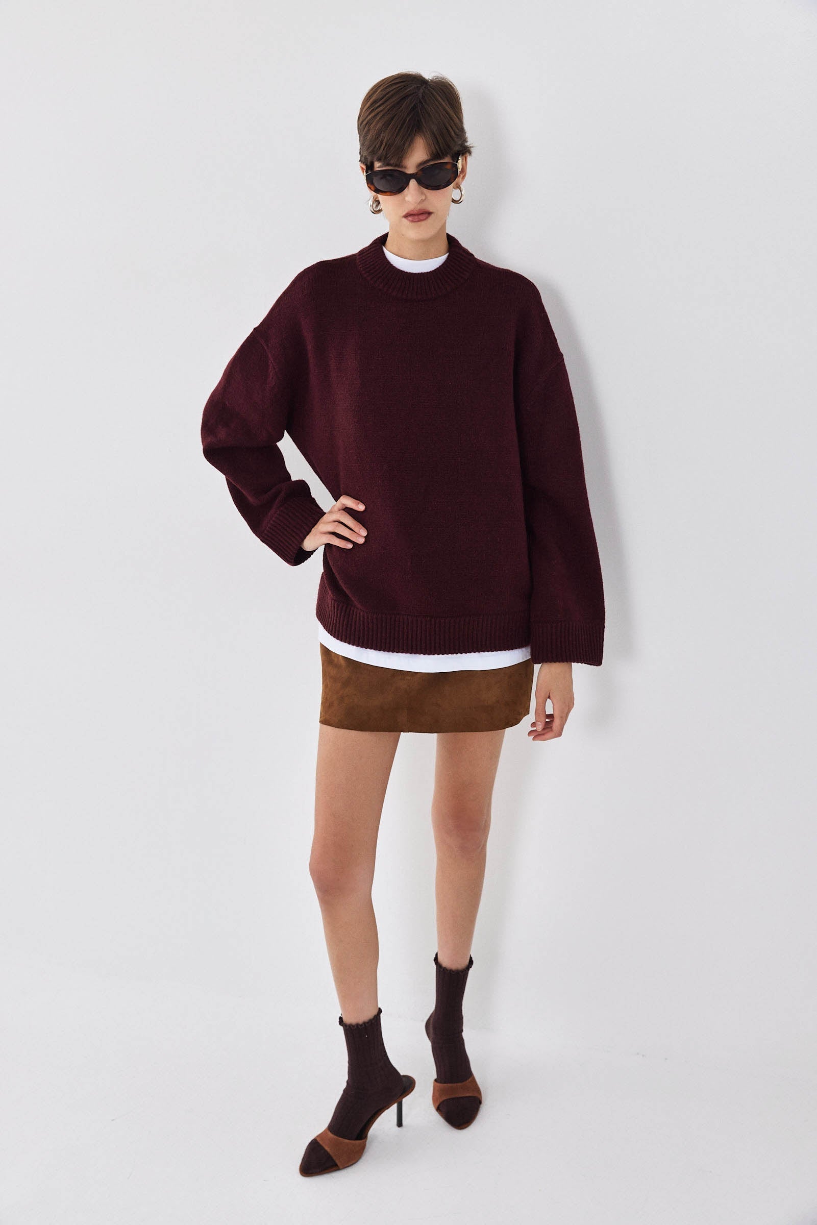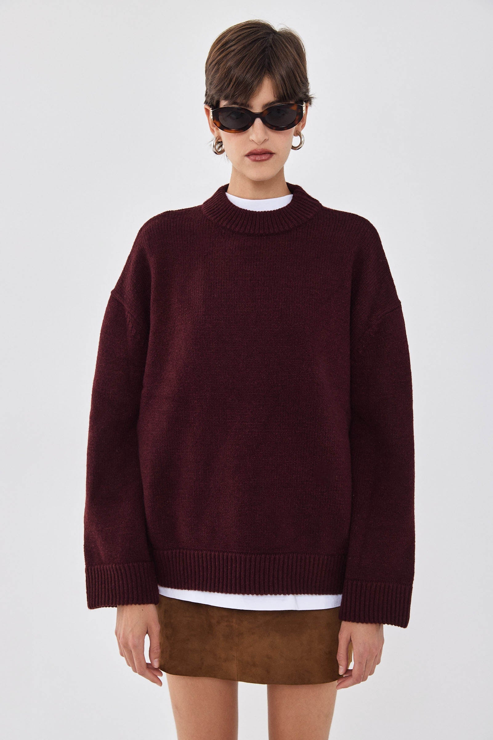 Your new favorite cozy winter jumper, the newest addition to our fully fashioned knitwear collection. Oversized mock neck jumper. Drop shoulder sleeves. Wide ribbed finish. Silicone tonal logo patch at the back. Style it with a suede mini skirt, matching burgundy socks and add delicate tonal accessories for the most stylish winter look.