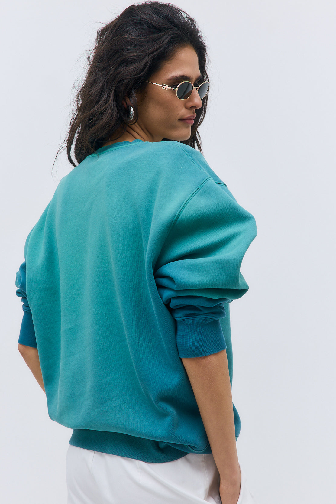 An everyday sweatshirt done right. Crewneck sweatshirt. Detailed with ribbed finishes. Designed with a subtle embroidered tonal logo at the front and centre. Finished with a garment wash and spray-like effect that creates a gradient look. Style it with our stylish and Ribbed Leggings and layer our iconic Faux Fur Cropped Coat for an everyday look with a refined, off-duty feel.