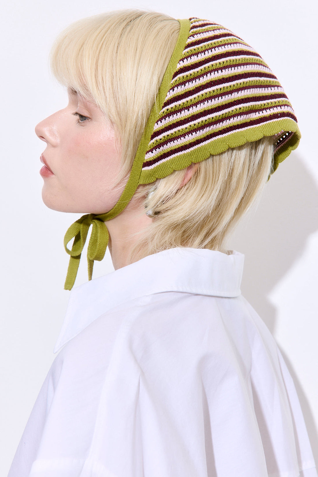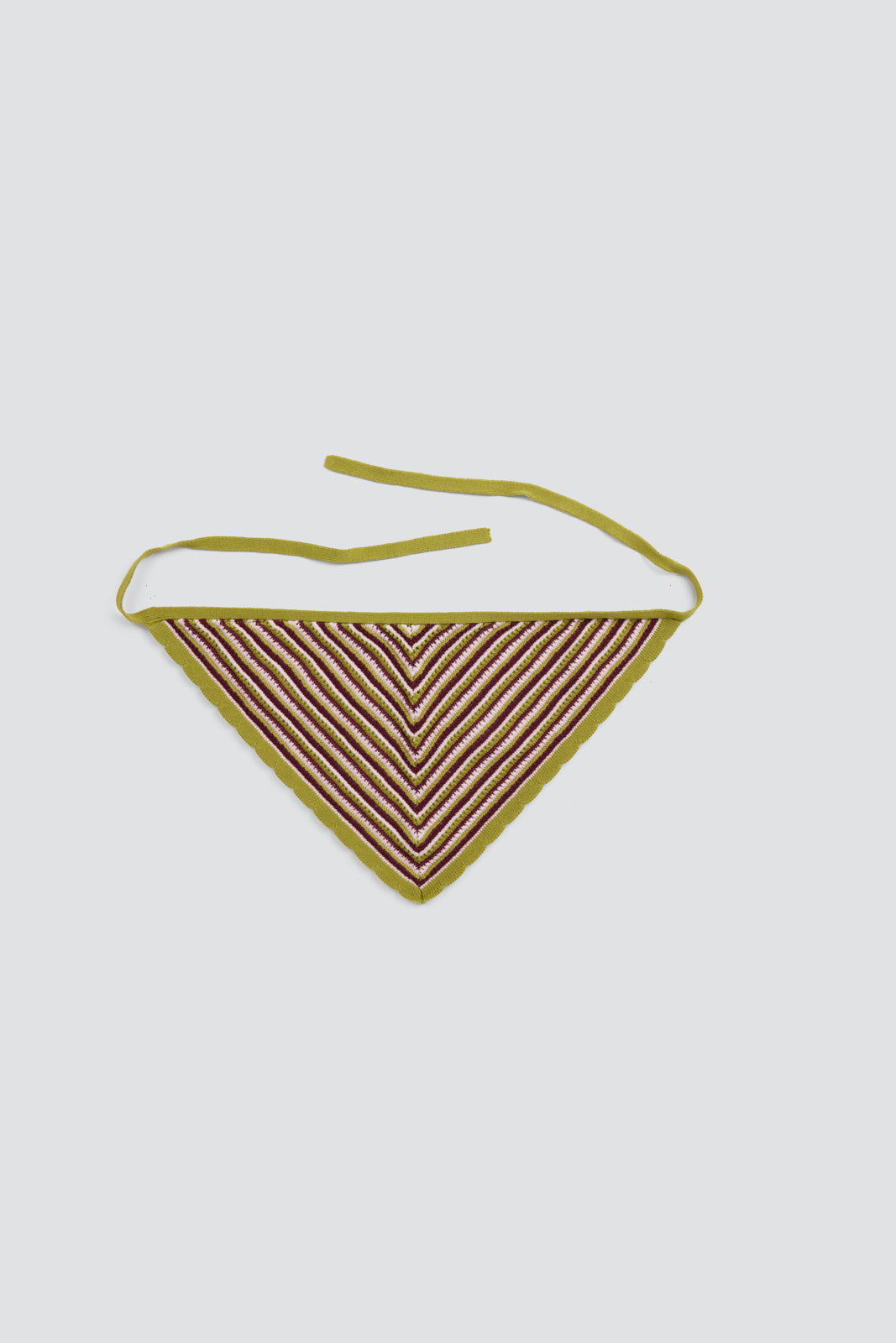Our most exciting crochet piece ever made. Triangular shape bandana. Ribbed tie straps for adjustable fit. Soft, lightweight knit fabric. Slightly sheer texture. Versatile styling as headscarf or accessory. Style it with our mini crochet tank dress and our beautiful oval sunglasses for the classiest summer look.