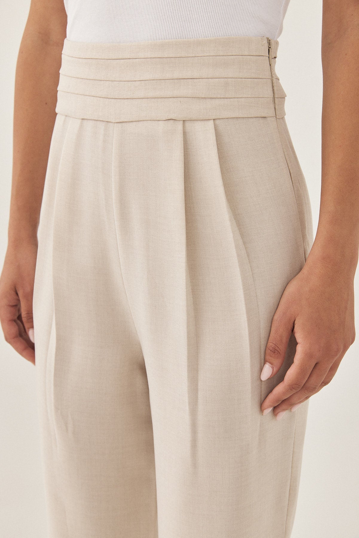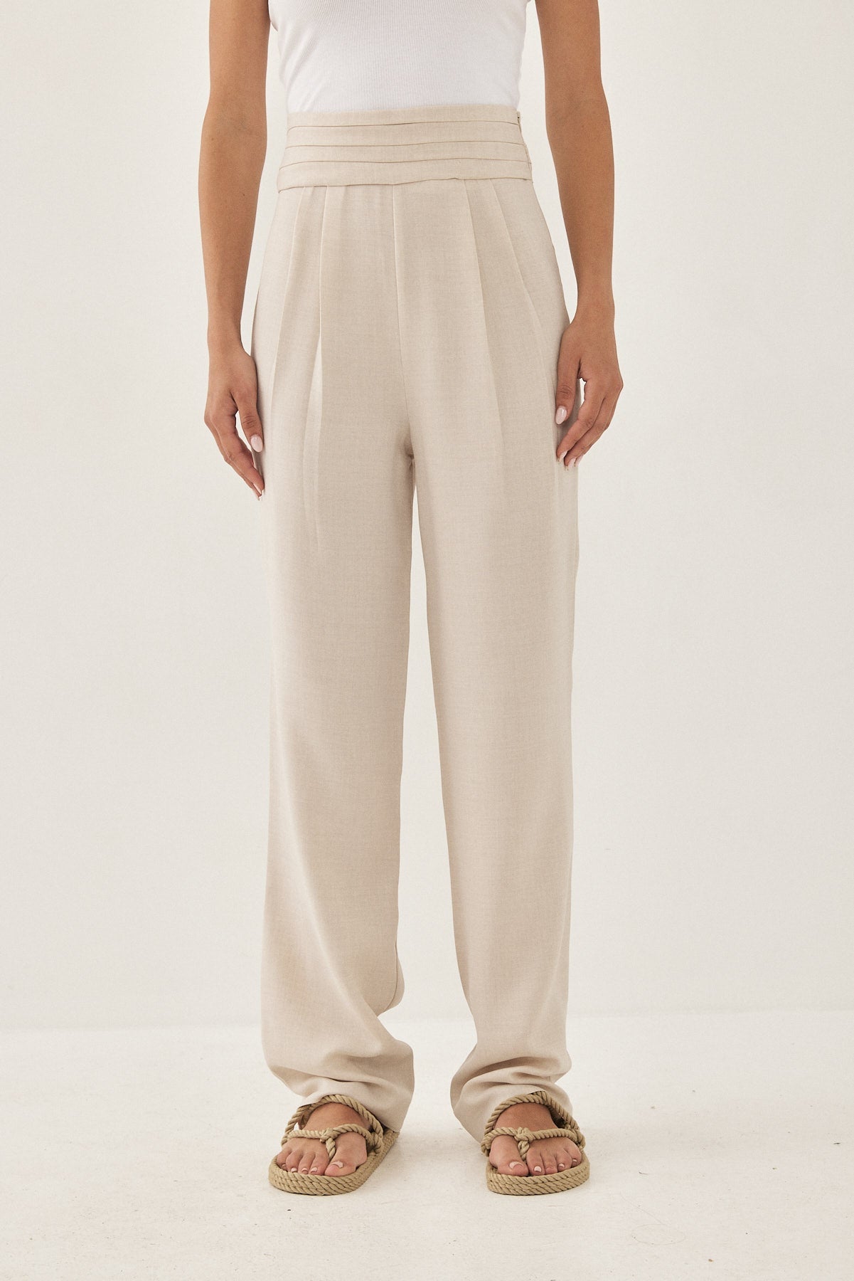 High waisted trousers made from a lightweight fabric. Features pleat detailing at the front. An accentuated high waist with delicate folding detailing. Style yours with the matching top for the perfect summer look.