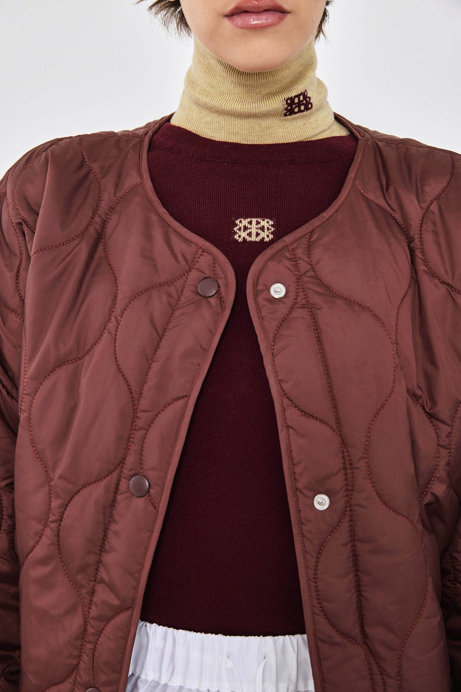 An ultra-chic addition to your fall-winter wardrobe. Quilted lightweight coat. Onion quilt pattern. Unlined. Features engraved snap buttons closure. Two front pockets with a snap button closure. Luxurious tonal metal logo placed on the side pocket. Style it over your favorite De fitnéss club active set, a pair of our oval sunnies and our matching quilted clutch for a chic everyday look.