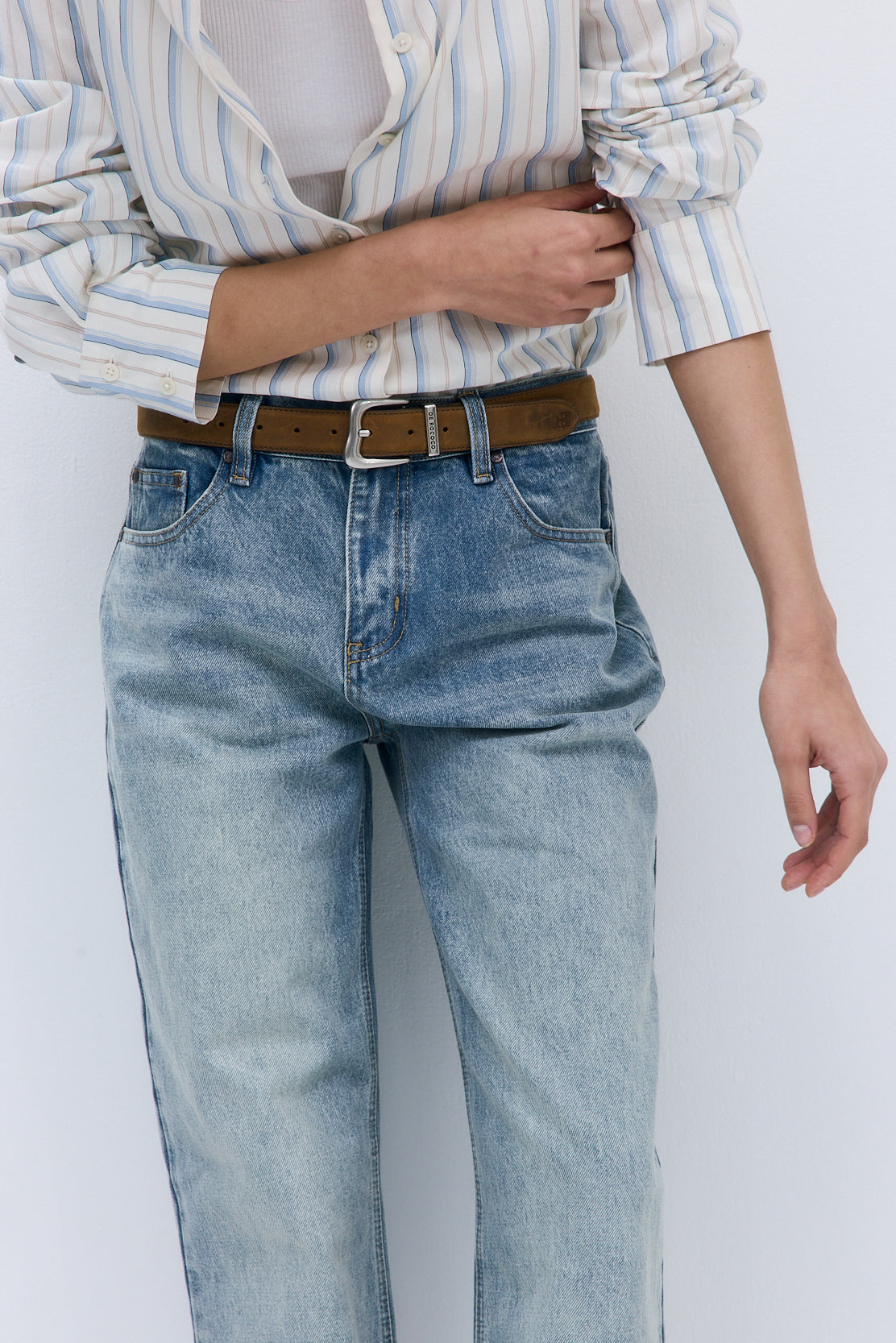 Your new go to denim. Our No.11 denim is a mid rise full length with a baggy fit. Featuring a buttoned and zipper closure as well as a logo leather patch detail on the back. Detailed with two front pockets, two back patch pockets, a classic coin pocket, and our signature jean buttons. Style it with our iconic Turtleneck Intarsia Jumper and our timeless Oval Sunglasses for an effortless, yet chic everyday outfit.