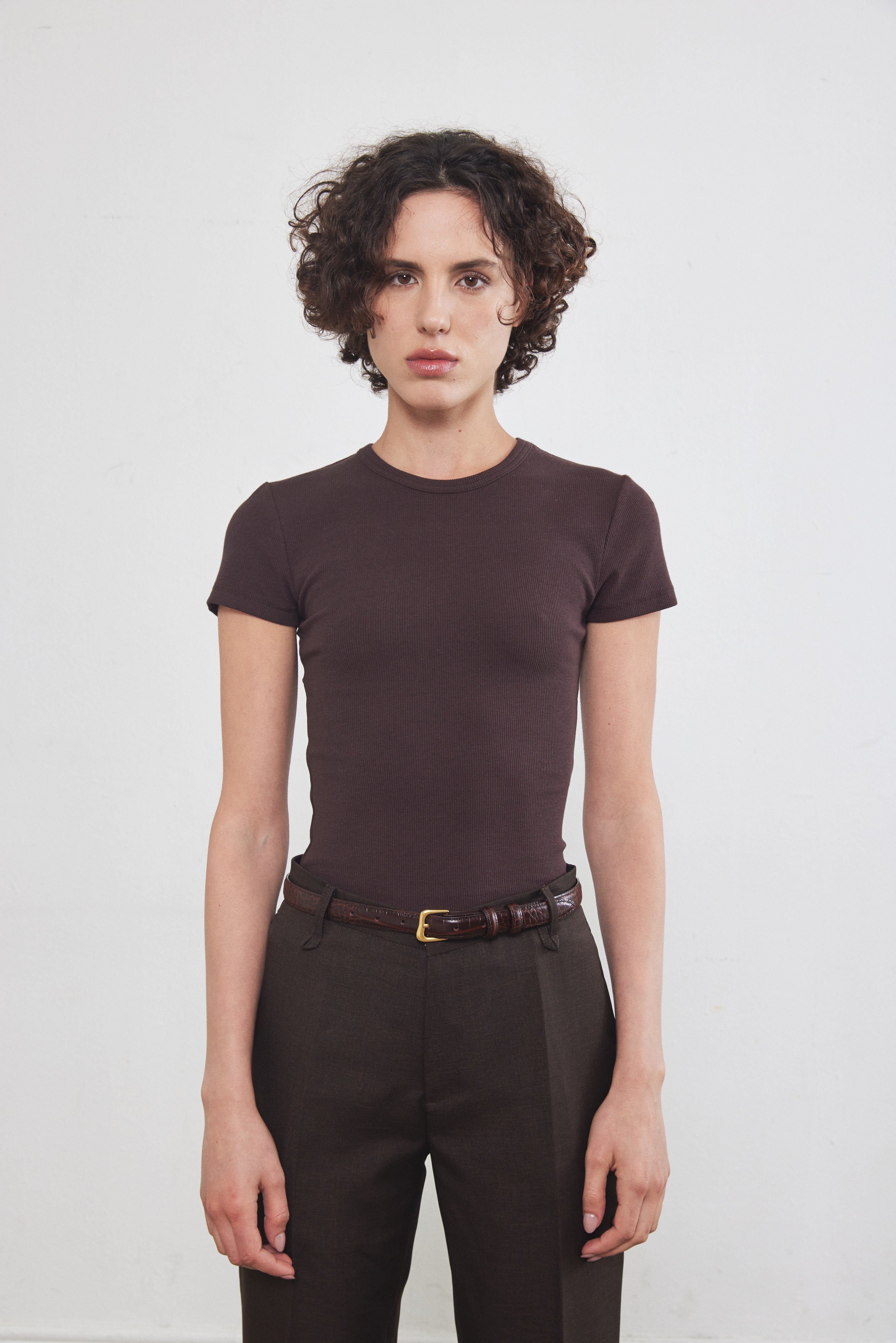 Short sleeve ribbed top. Features a crew neckline and a close fit. A basic T shirt that goes with every bottom and easy to layer.
