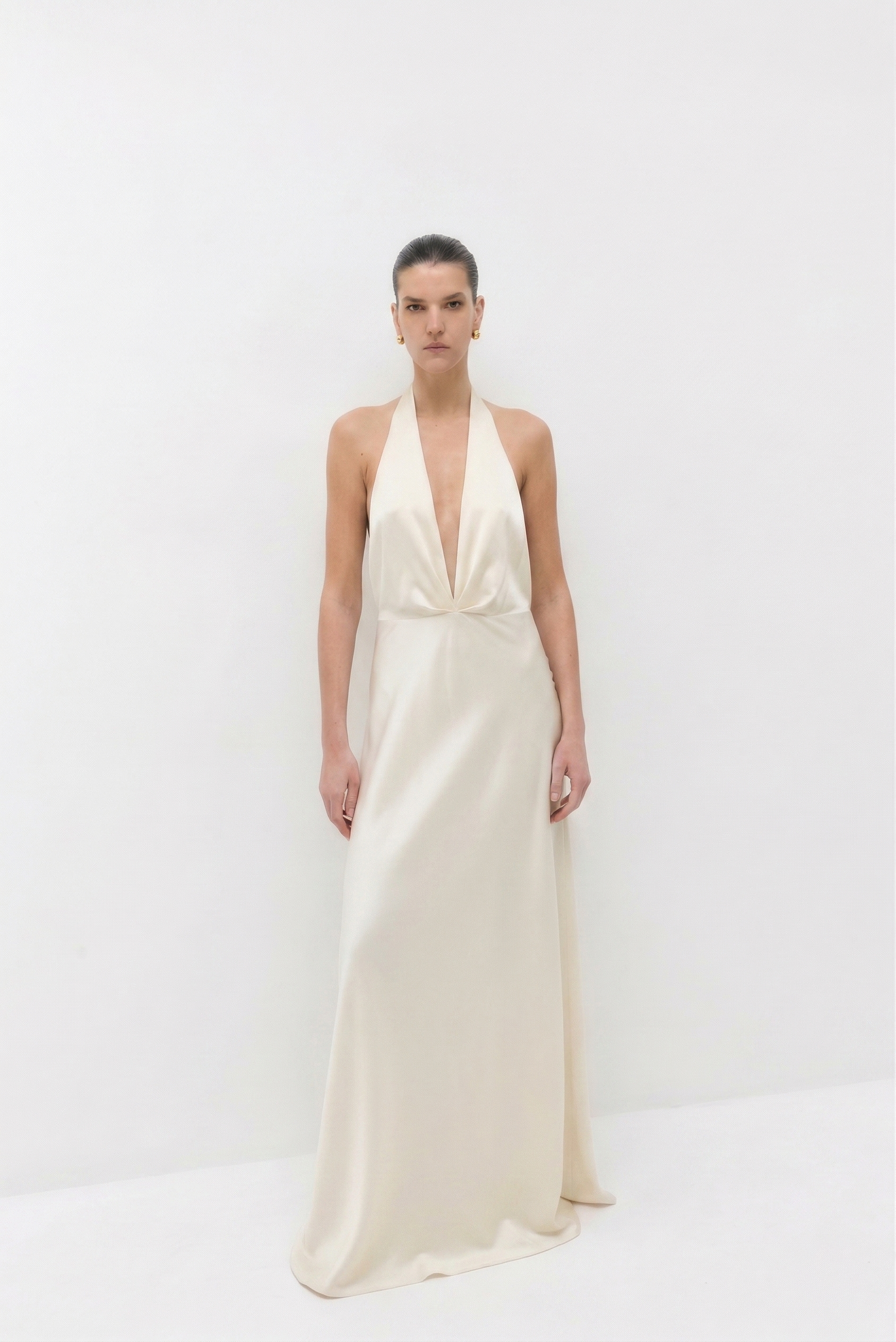 A clean, sculpted silhouette with precise detailing. Satin Halter Maxi Dress. Designed with double-layered fabric and a deep V neckline. Doesn't crease. Features wide triangular shaping at the bust with two subtle pleats at the center front. Detailed with a straight open back and fabric covered buttons throughout the side seam. Cut slightly below the waist, falling into a fluid, elongated shape. Style it with our iconic Christy Sunglasses and pair those with our refined Yvon Shoulder Bag for an elevated event-ready look.