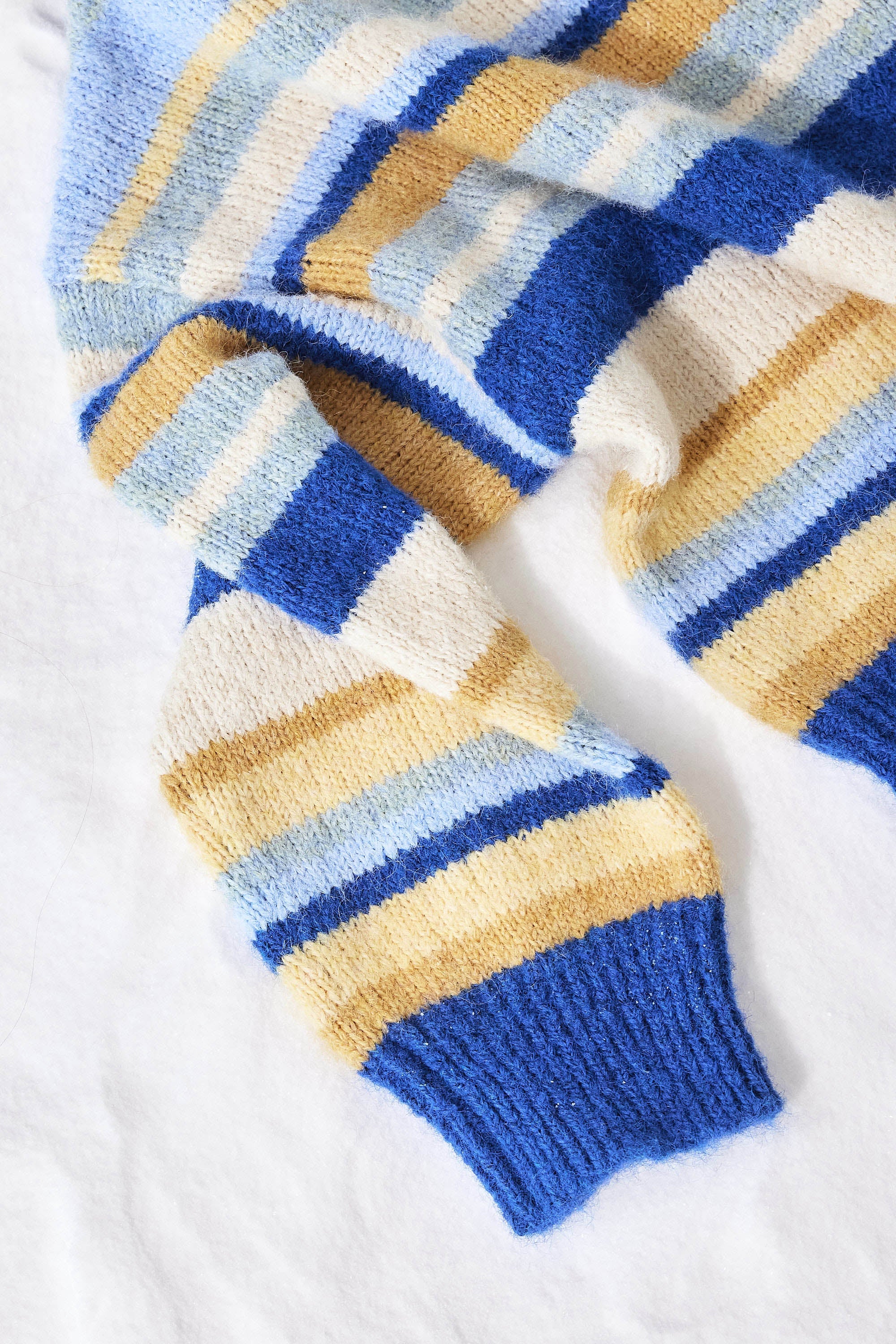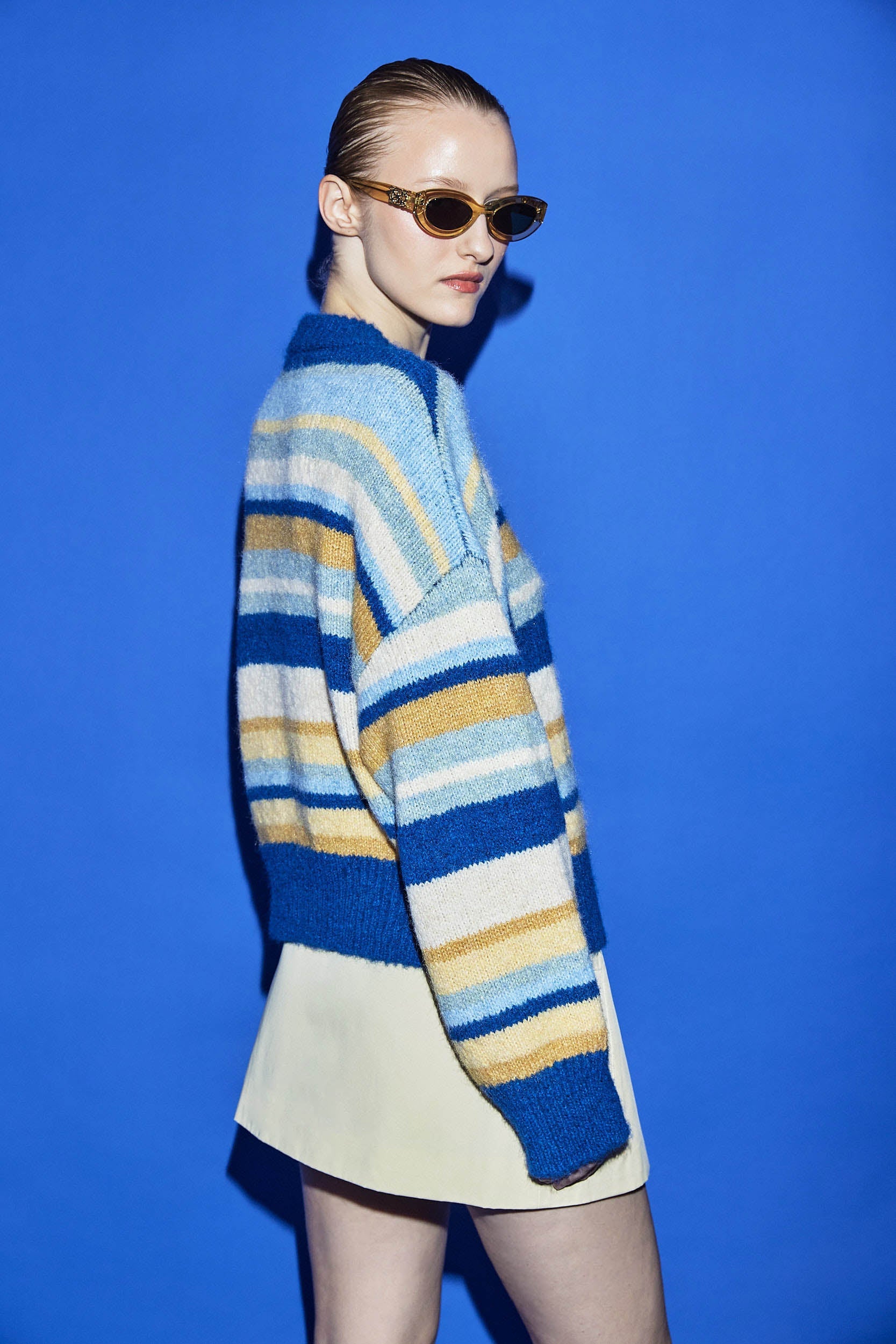 The newest addition to our Fuzzy collection. The ultimate blend of comfort and style. Vintage inspired stripes pattern. Relaxed oversized fit. Soft and cozy fabric. Ribbed crew neckline. Ribbed finish on the cuffs and hems. Cable knitting. Style it with a pair of our flattering denim, our cool oval sunnies and throw a classic trench coat on top to seal this classy look.