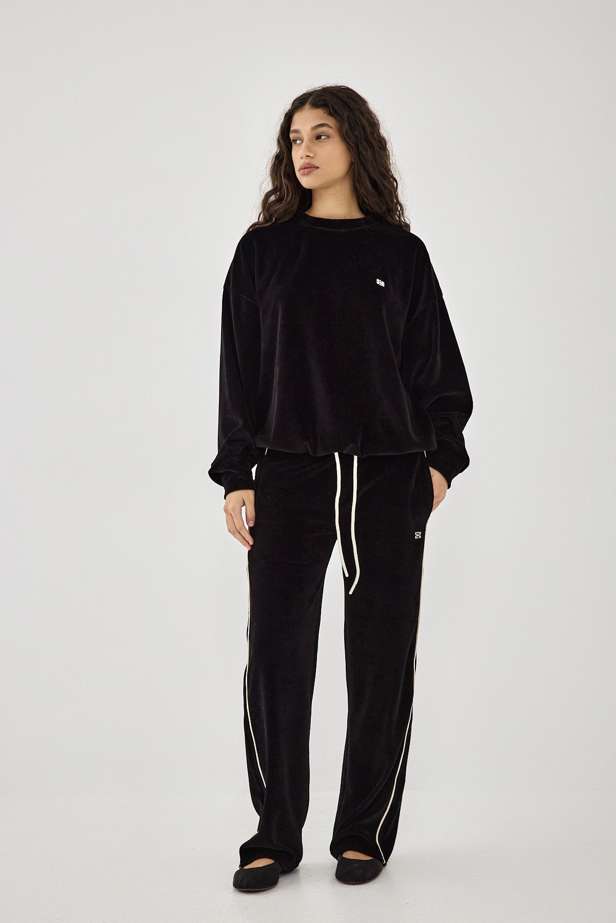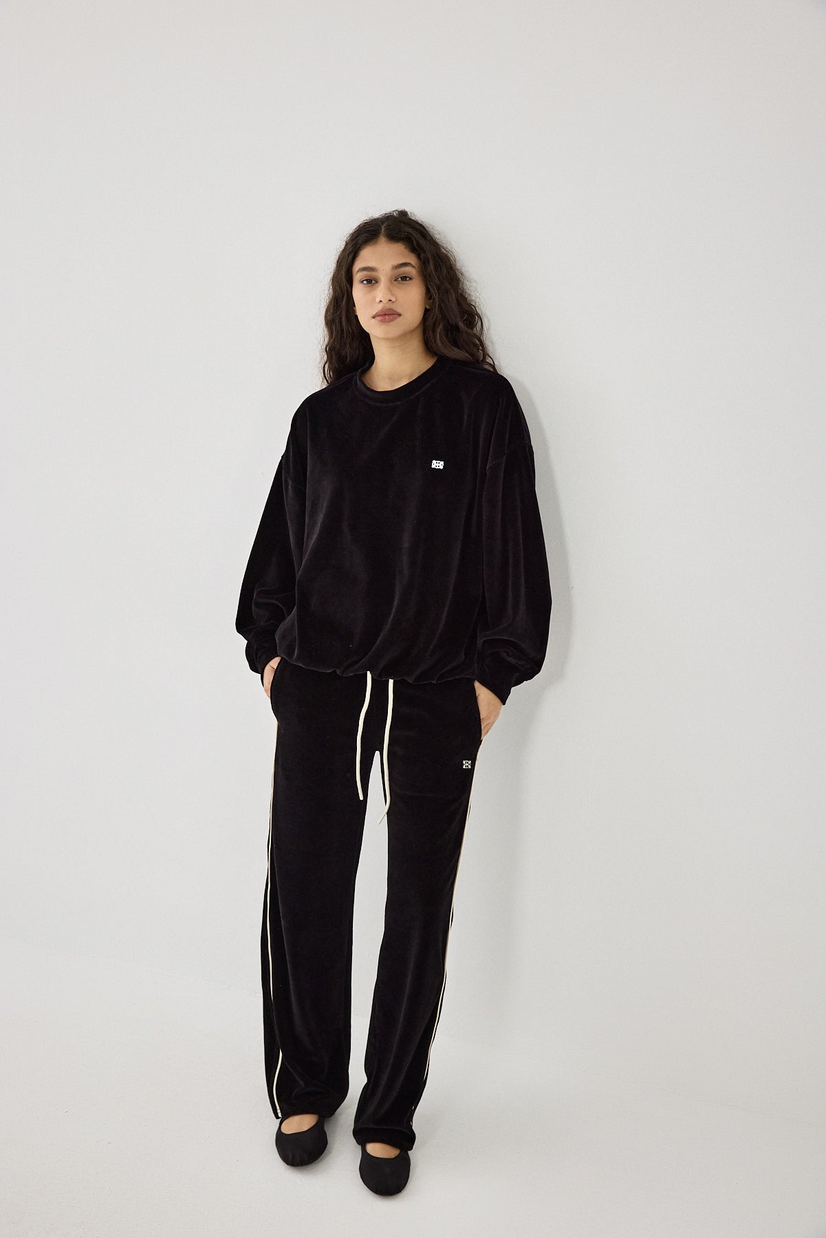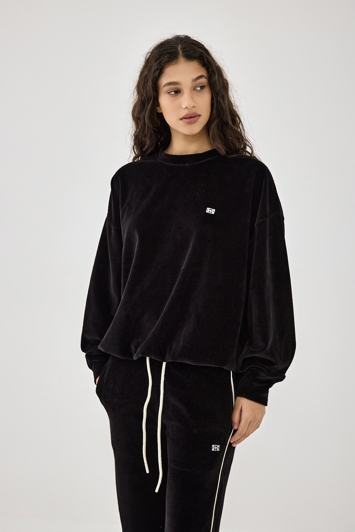 Meet the chicest addition to your wardrobe. Super soft material. Velvet crewneck sweatshirt. Cuffed finish. Contrast logo embroidery detailing. Drop shoulder sleeves. Unlined. Style it with the matching joggers and a pair of ballet flats for an effortlessly chic look.