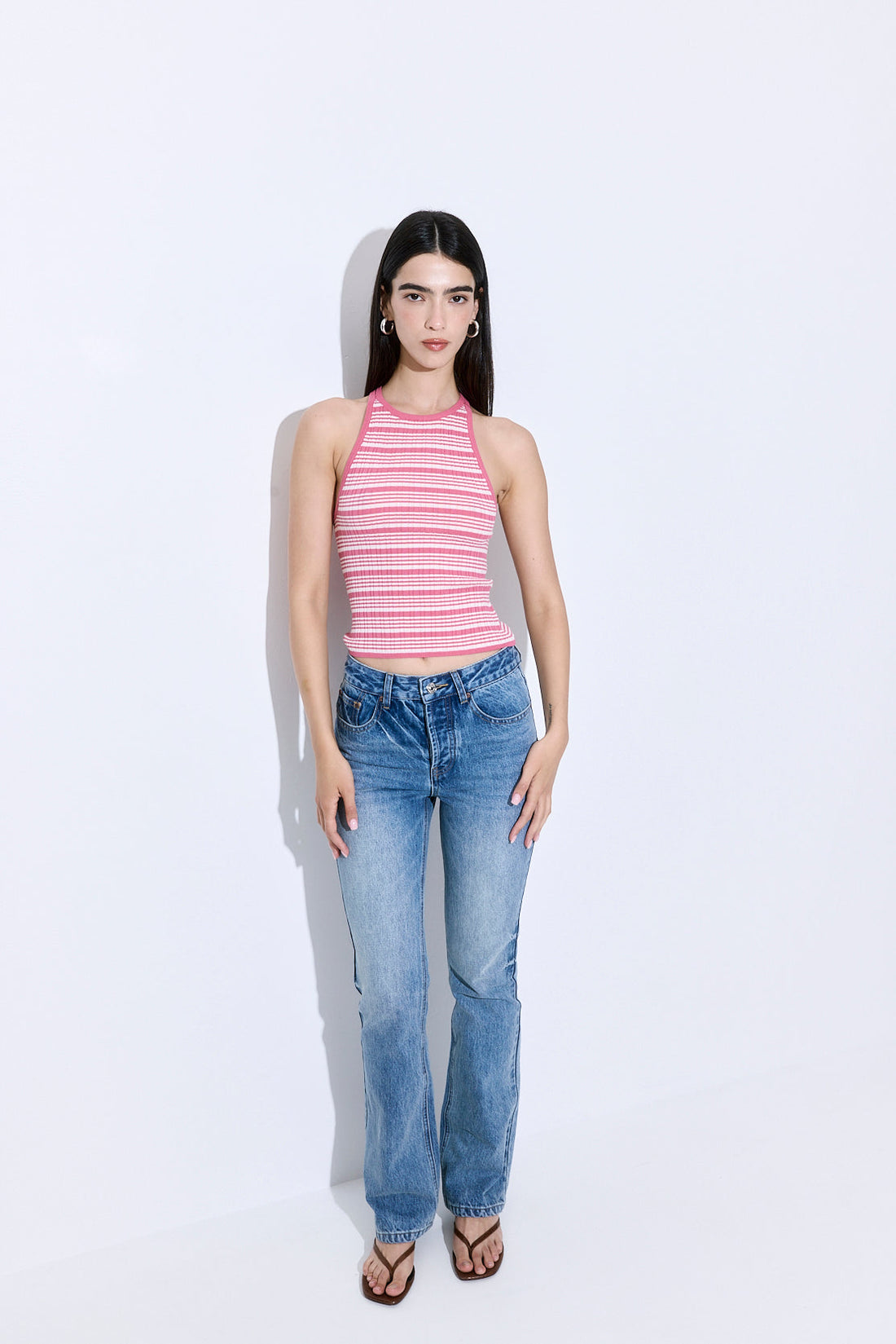 Your go to summer essential. Lightweight and breathable ribbed fabric. Delicate crew neck. ribbed finish. Features a tonal silicone squared logo patch at the upper back. Gently skims the body for a flattering, easy fit. Style it with our new linen mid rise pants, a matching scrunchie and our round sunglasses for an everyday beautiful look.