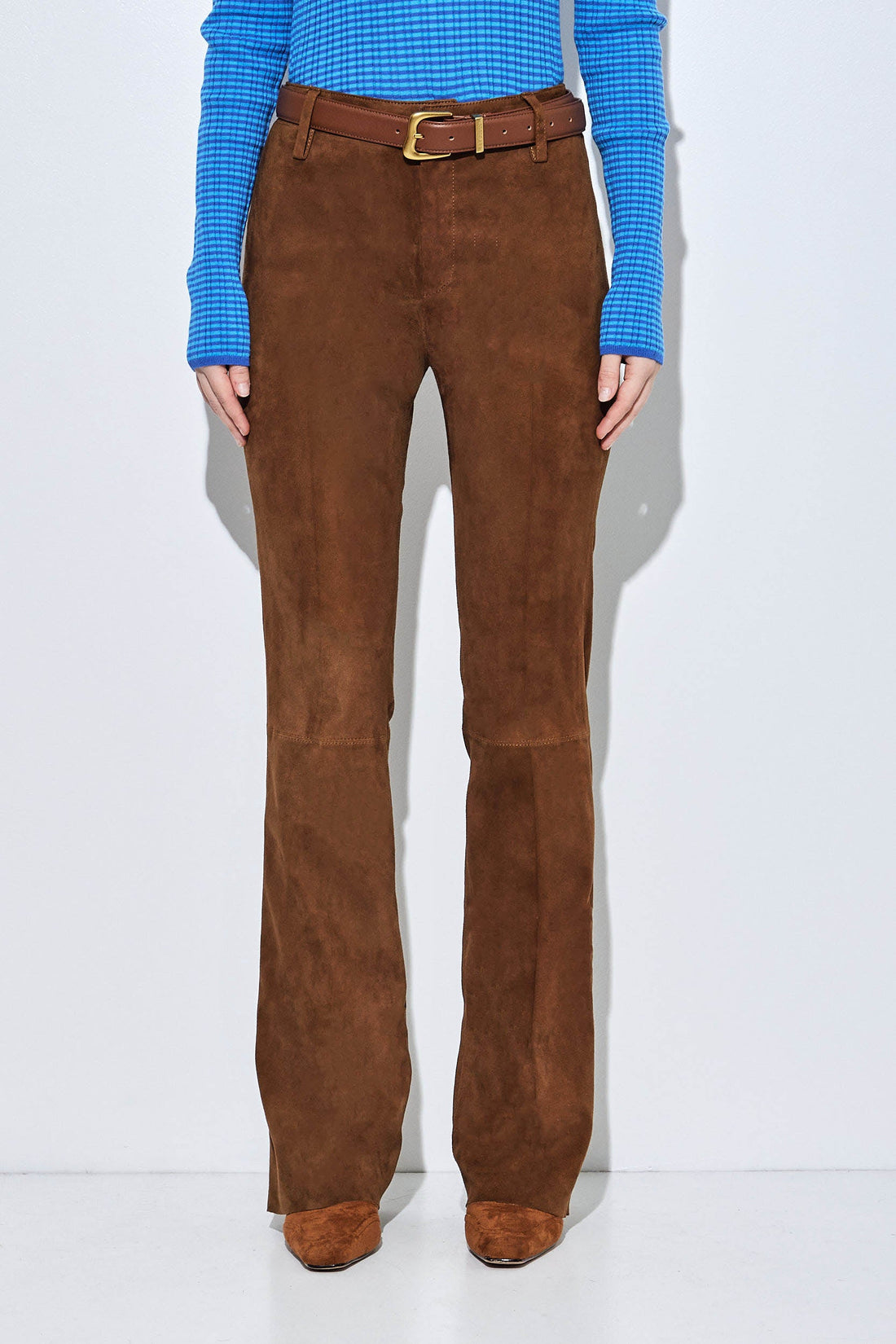 Our new bootcut suede pants are the ultimate suede statement. Mid-waisted with a flattering bootcut silhouette. Crafted from 100% premium suede leather for a soft and luxurious feel. Fine, high-quality stitching. Slightly stretchy. Full length. Metal hook and zipper closure. Raw hem. Unlined. Delicate belt loops. Tonal logo leather patch at the back. Designed to elongate the legs and enhance the silhouette. Style it with our beautiful suede jacket, a lightweight turtle neck and a pair of our oval sunnies for a cool day to night look. Invest once, wear a lifetime.
