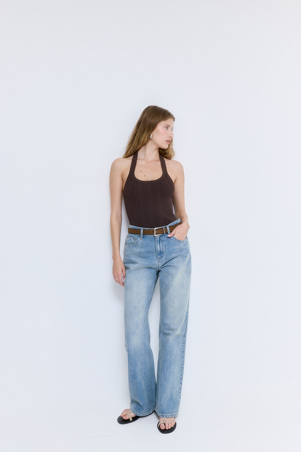 A fresh take on our beautiful ribbed staples. A summer essential with the most flattering silhouette. Stretchy ribbed fabric that hugs the body. Fully fashioned finish. Halter neck. Scoop neckline. Open back. Tonal logo silicon patch on the back. Style it with our chic Micro Mini Skirt and our elegant Yvon Shoulder Bag for an effortless look.