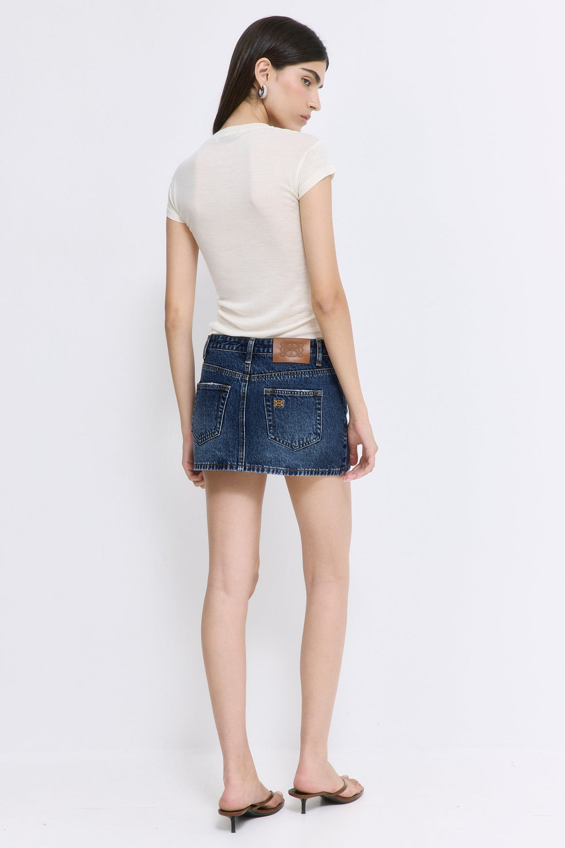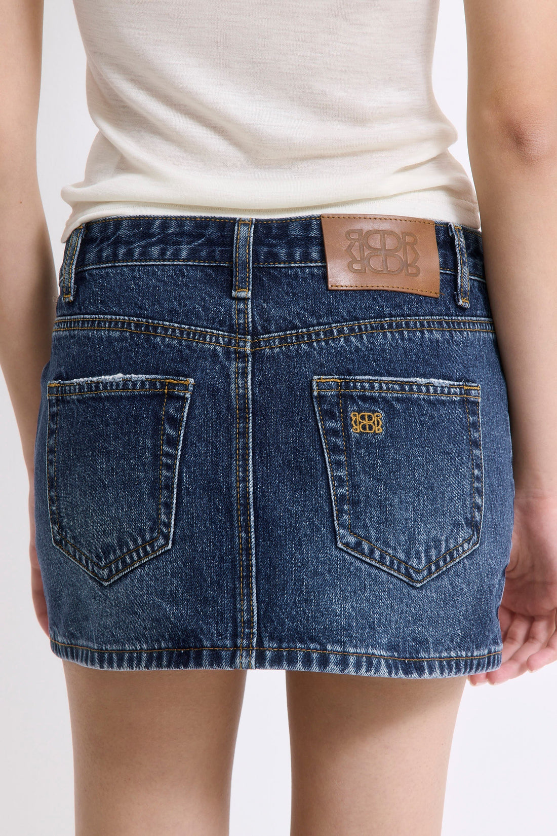 The perfect low-rise denim mini skirt. Features belt loops and a frontal zipper closure. Clean finish. Featuring two front pockets and two back pockets. Luxurious leather logo patch on the back. Contrasted logo embroidered detailed on the back pocket. Style it with our new logo sheered top, our croco belt and our classy Yvon shpulder bag for the perfect look.