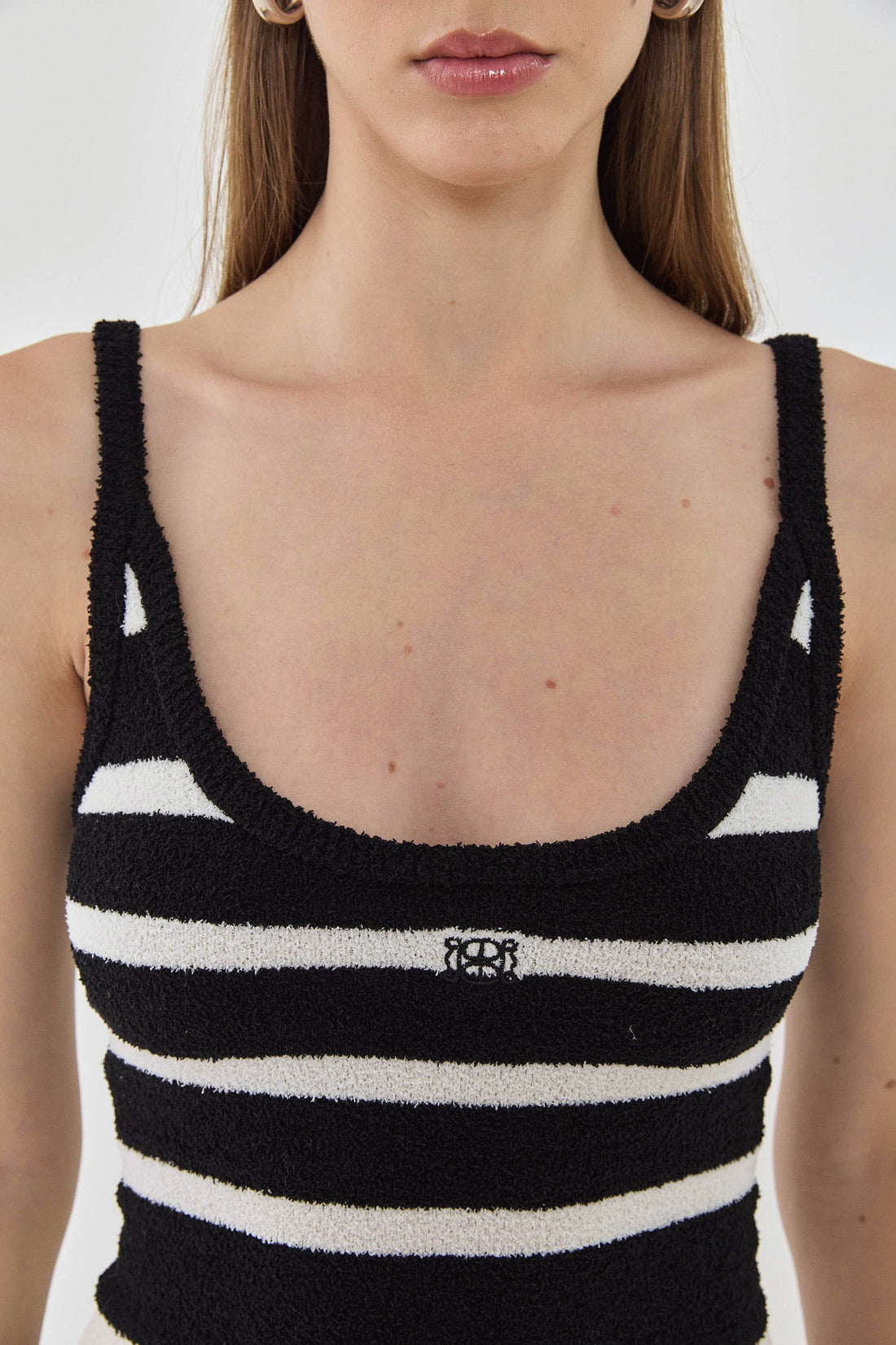 Want to feel like you're in Positano? This dreamy dress will make you feel like you're there. Made from the coziest boucle fabric. Round scooped neckline. Thin cami straps. Mini length, perfect for summer weather. Featuring an embroidered logo detailing on the front. Stretchy fabric, hugging the body. Style it with your favorite sunnies, sandals and ratan tote for the perfect summer beachy look.
