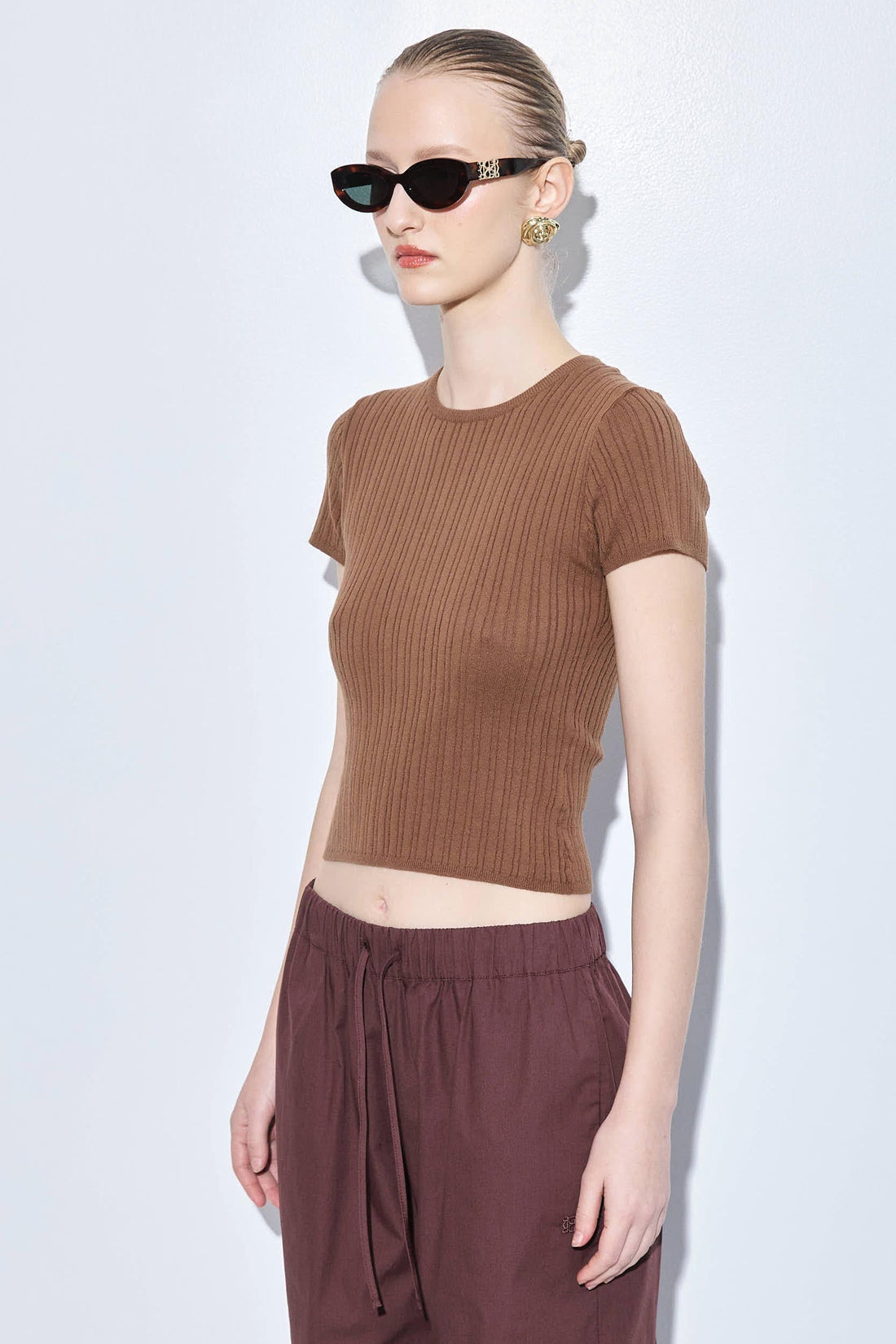 Our ribbed crew neck T is a true summer wardrobe essential. Ribbed crewneck collar. Contrast ribbed finish. Featuring a tonal silicone logo patch detailing at the upper back. Style it with our linen maxi skirt, a pair of our beautiful sunnies and our cool scrunchie to seal this gorgeous look.
