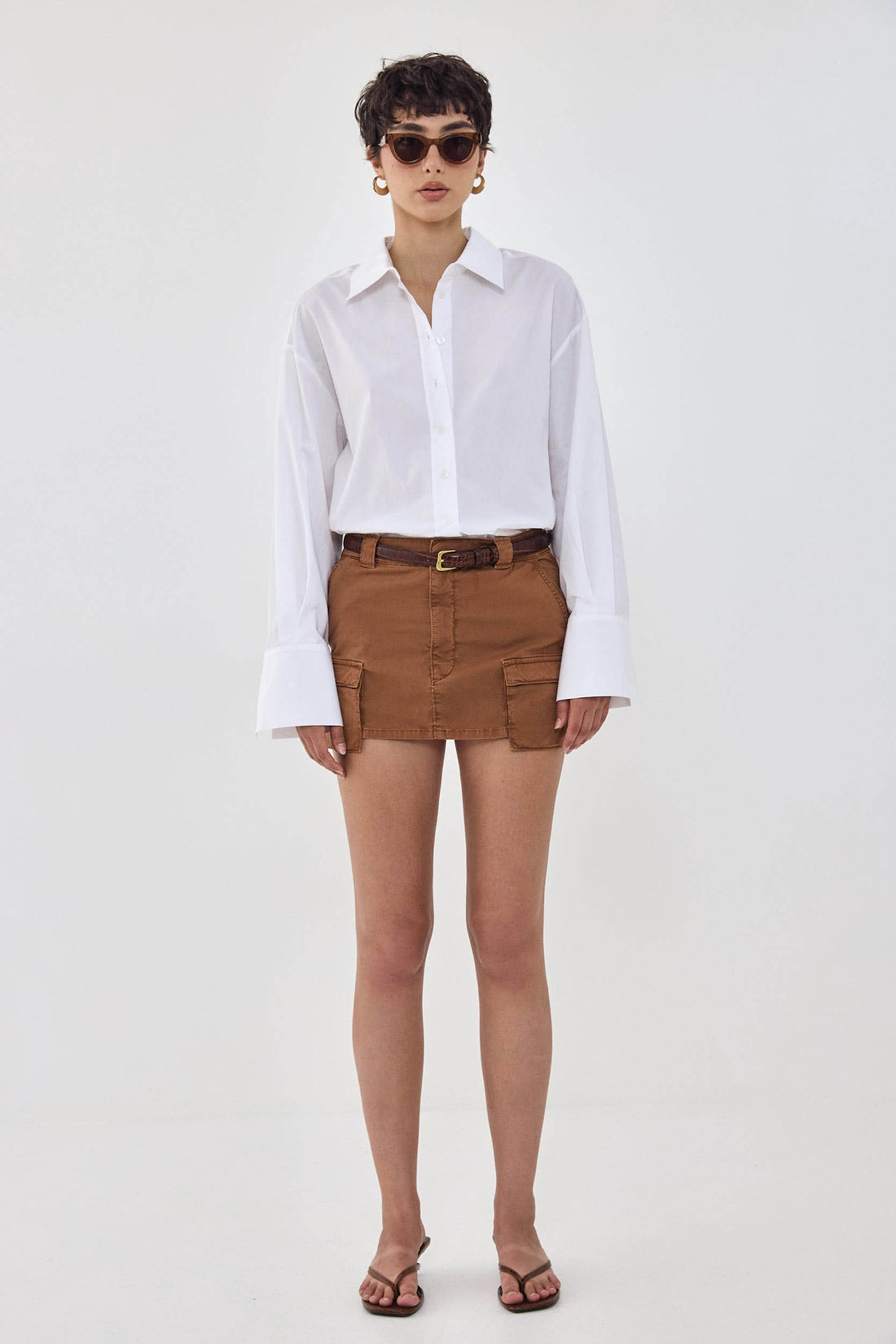 Poplin is this season's most fashionable fabric. A classic oversized button down is an absolute wardrobe essential. Long sleeved button down. Drop down shoulders. Delicate balloon sleeves. Crispy poplin fabric. Buttoned frontal closure. Engraved logo detailing on the buttons. Back yoke. Two back pleats offering extra volume. Pleat detailing at the sleeve for extra volume. Wide cuff featuring two buttons. Style it with a matching poplin bottom of your choosing for an easily fashionable everyday look.