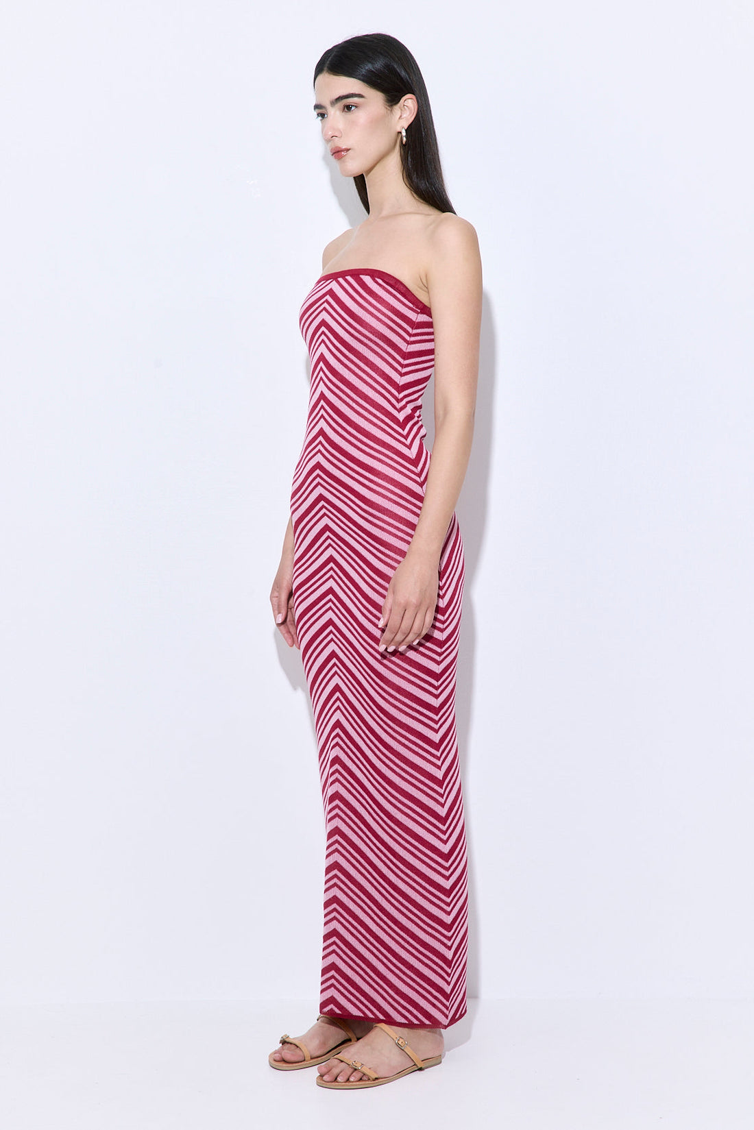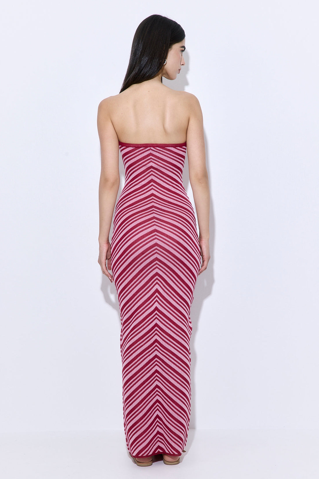The most stylish summer knit maxi dress. Knit geometrical pattern that will make you ready to plan your next vacation. Contrast elastic band at the chest for extra grip. Hugs the body. Maxi full length. Style it with your favorite sandals and golden accents for the perfect summer pop of color.