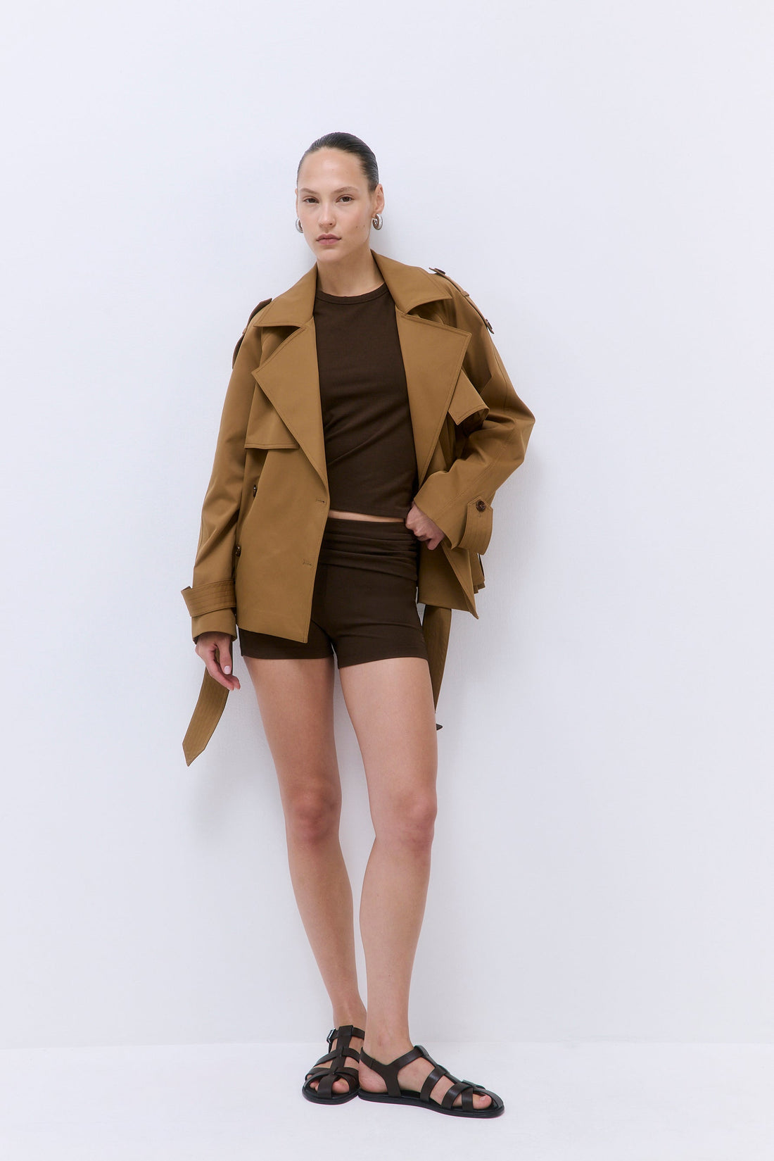 Our Lounge Shorts are the softest layer you’ll slip into. Crafted from buttery, body-hugging fabric. Fold-over adjustable waistband. Can be styled mid-rise or low-rise. Tonal logo embroidered on the front side. Style it with our matching Lounge T Shirt and chic Double Breasted Cropped Trench Coat for ultimate comfort and an effortless vibe.