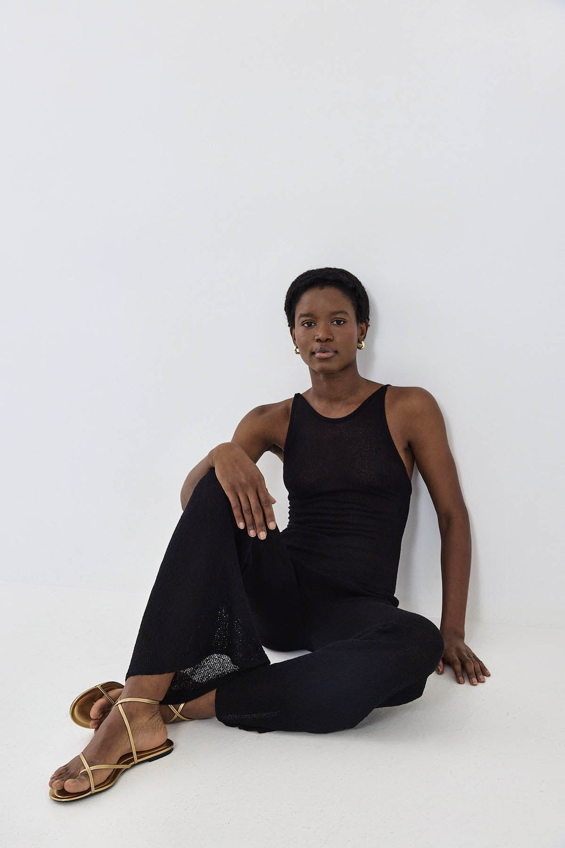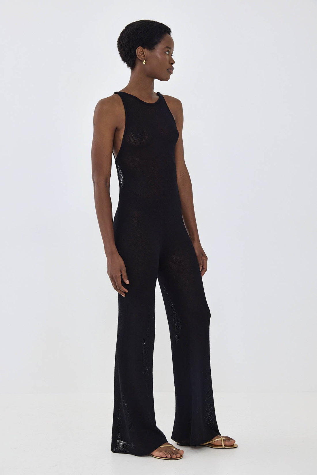 Collared crochet jumpsuit. Full length. Ultra flattering material that hugs the body. Wide leg. Full length. Open back. Versatile, can be tied in two ways, either as a collar with an open back or a delicate bow closure at the back. Ribbed finish. Style it over your favorite swim for the chicest resort look.Store your crochet garments flat or folded. Hanging them can cause the fibers to stretch and the item to go out of shape.