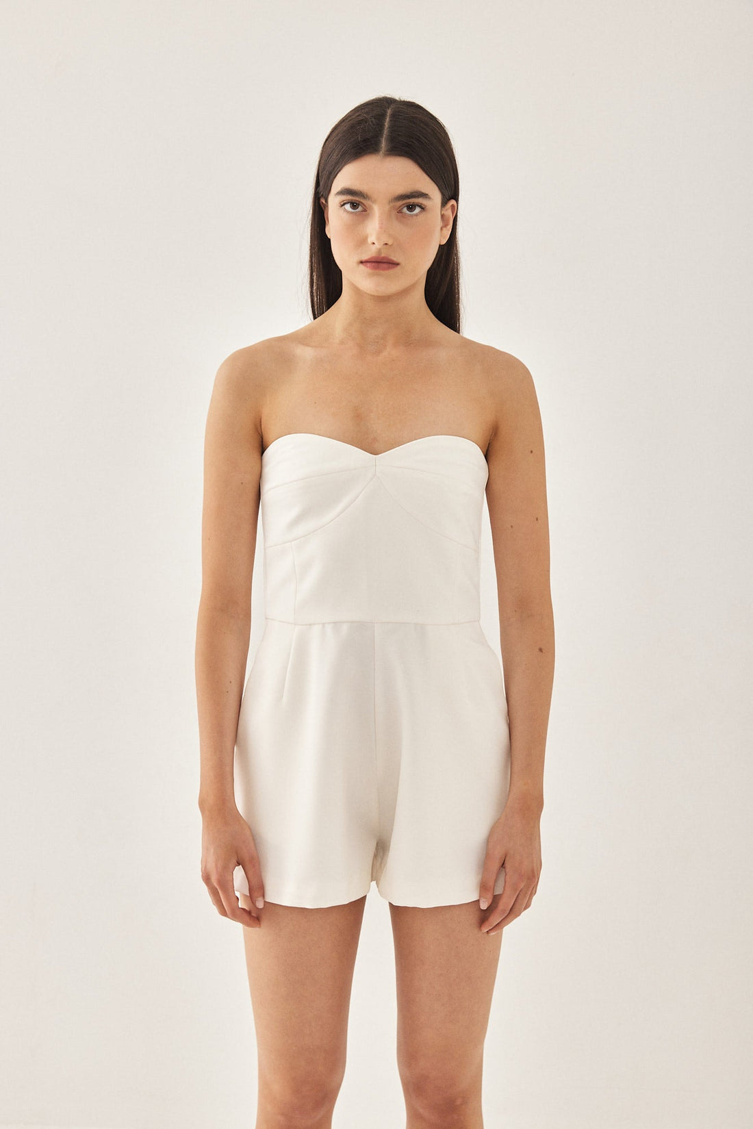 A strapless tailored jumpsuit with a corset fit top. Featuring a strapless neckline with a silicone strap for a better grip and a hidden zip closure. Featuring wiring at the sides for additional support. Embroidered logo at the back. A must have in your closet, perfect for styling up or down. Style it with a pair of kitten heels and a shoulder back for the perfect day to night look.