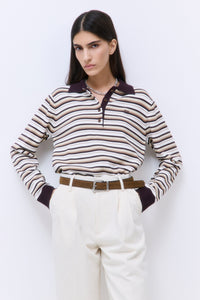 The newest addition to our timeless fully fashioned knitwear. Our new brown stripped polo shirt is a must have this fall. Long sleeved. Four branded buttoned frontal closure. Ribbed finish. Delicate embroidered logo on the front. Classic collar. Style it with our iconic No. 15 Denim and stylish Cateye sunglasses for the ultimate summer to fall look.