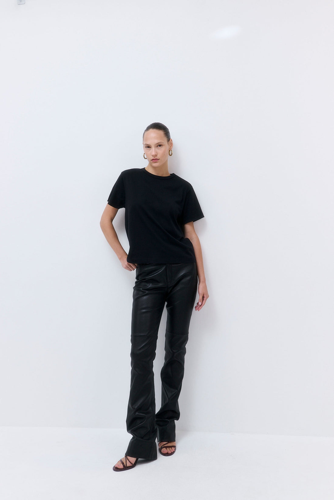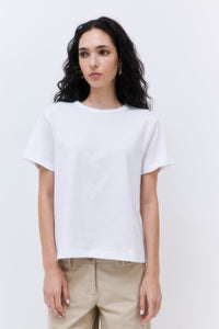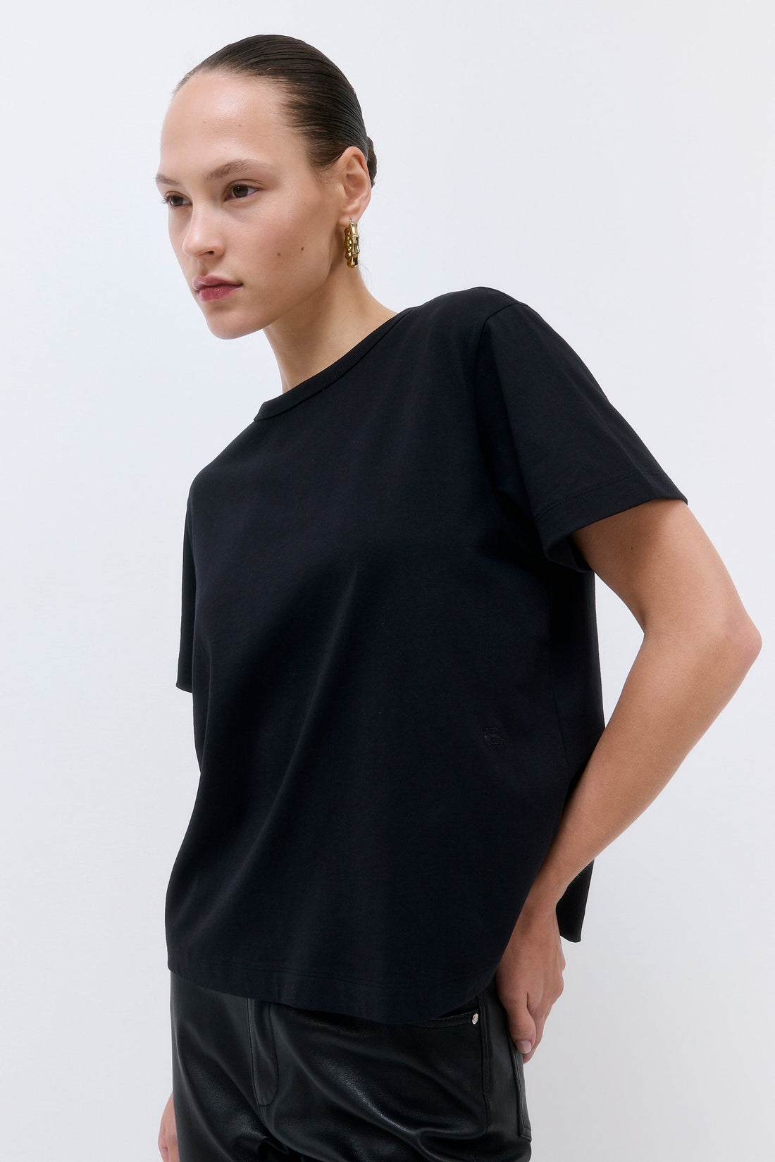Our Classic Boxy T Shirt is an iconic addition to the basics family. Crafted from crispy cotton. Relaxed, boxy fit. Classic sleeves. Crew neckline with ribbed trim. Tonal embroidered logo at the front. Style it with our capsule Wide Leg Cotton Pants and chic Oval Sunglasses for a refined look.