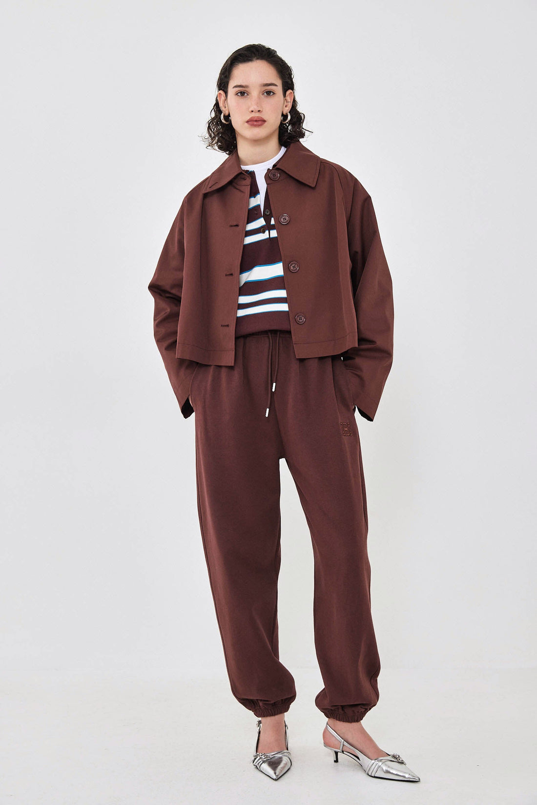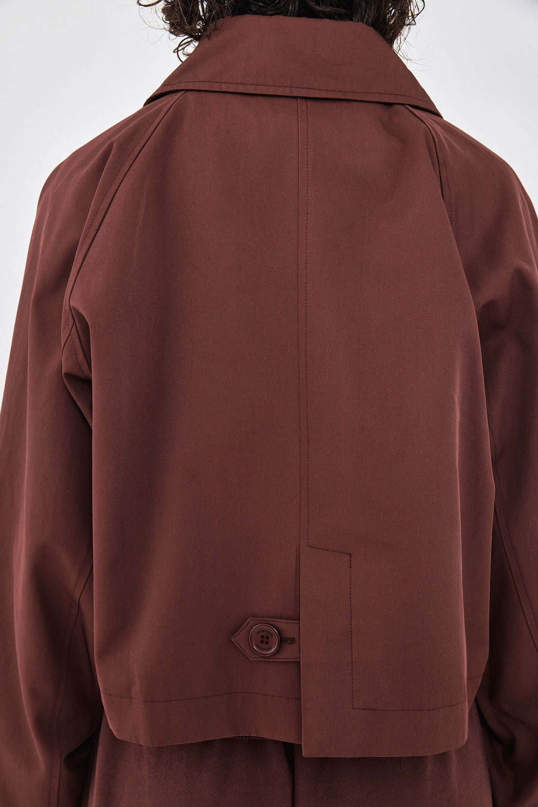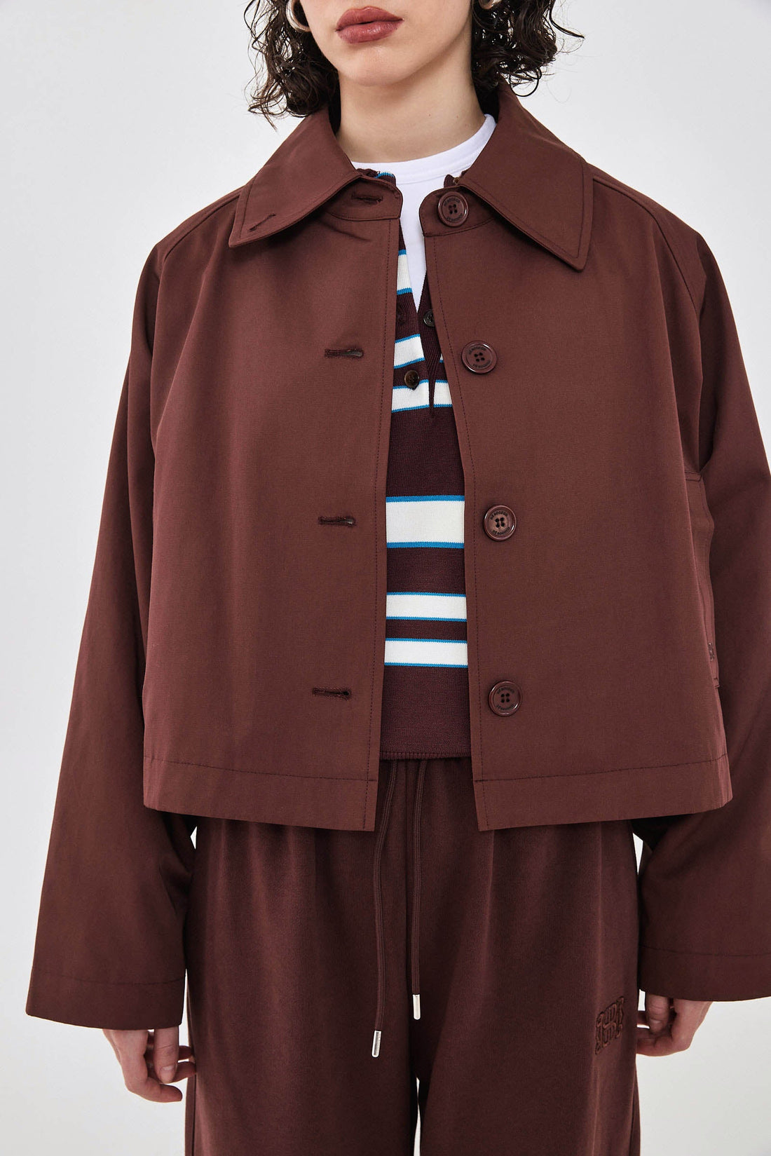 Our new cropped trench coat is the ultimate must have this fall. Made from a lightweight and breathable fabric. A loose fit with long voluminous sleeves and a back vent hem. Sharp pointed collar with engraved logo button closure. Delicate embroidered logo on the side pocket. Wind and water resistant. Wear yours with absolutely everything, from tailoring to track pants.