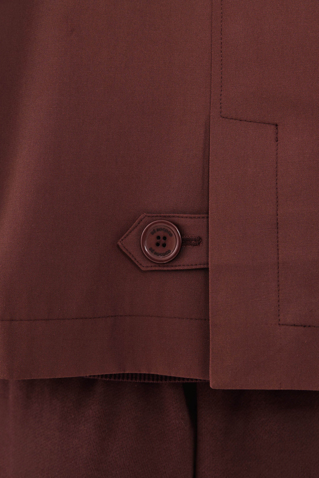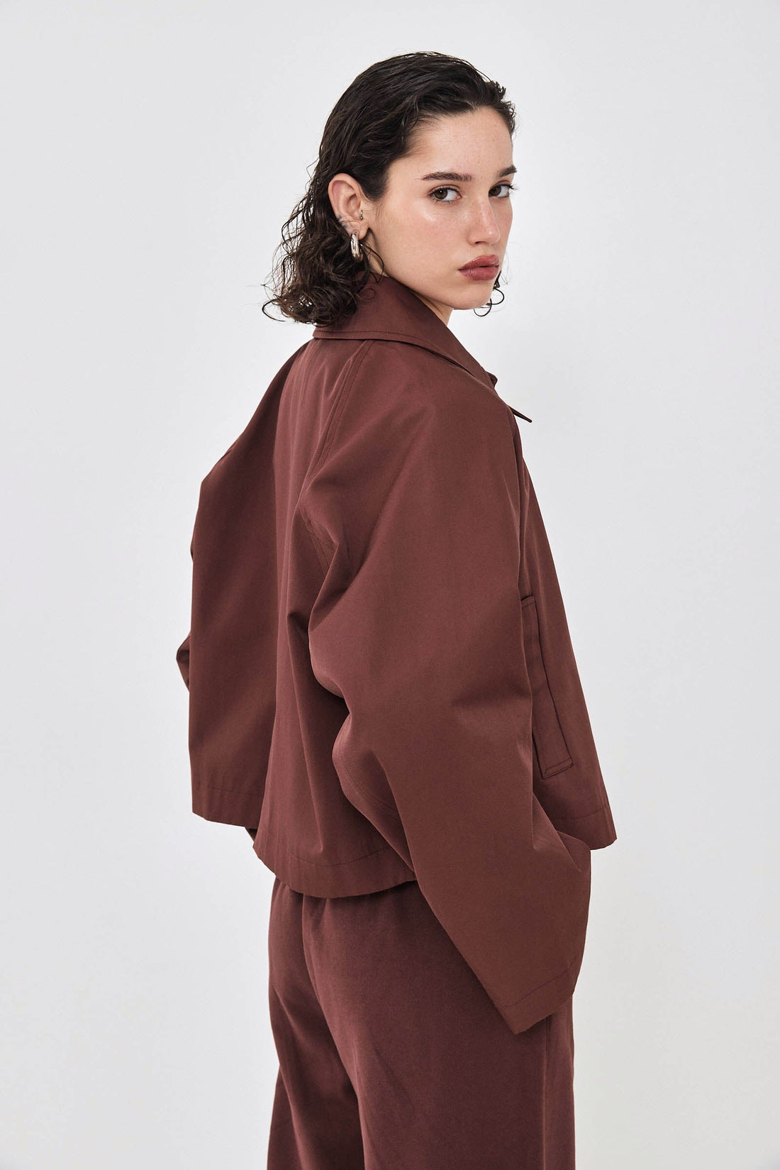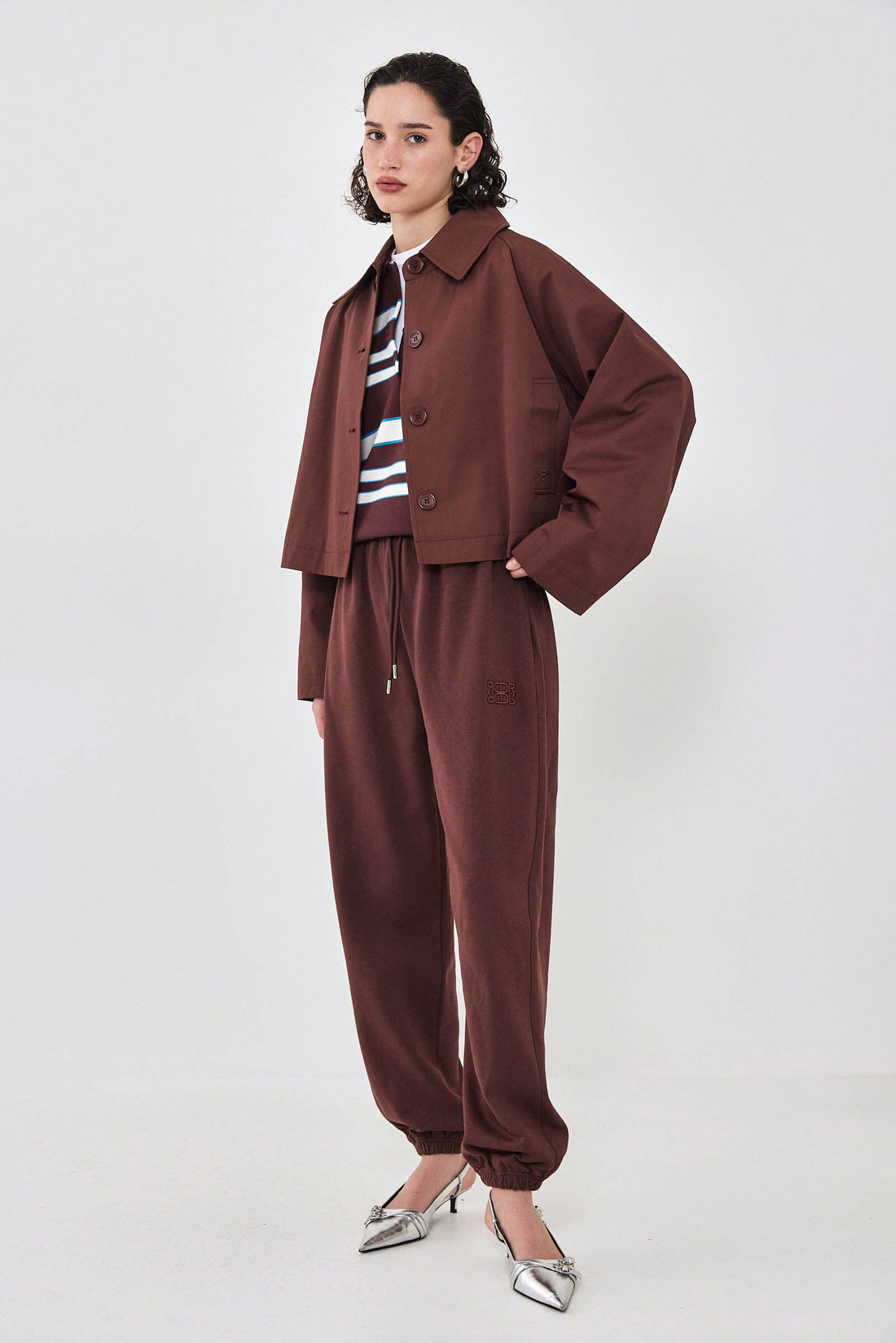 Our new cropped trench coat is the ultimate must have this fall. Made from a lightweight and breathable fabric. A loose fit with long voluminous sleeves and a back vent hem. Sharp pointed collar with engraved logo button closure. Delicate embroidered logo on the side pocket. Wind and water resistant. Wear yours with absolutely everything, from tailoring to track pants.