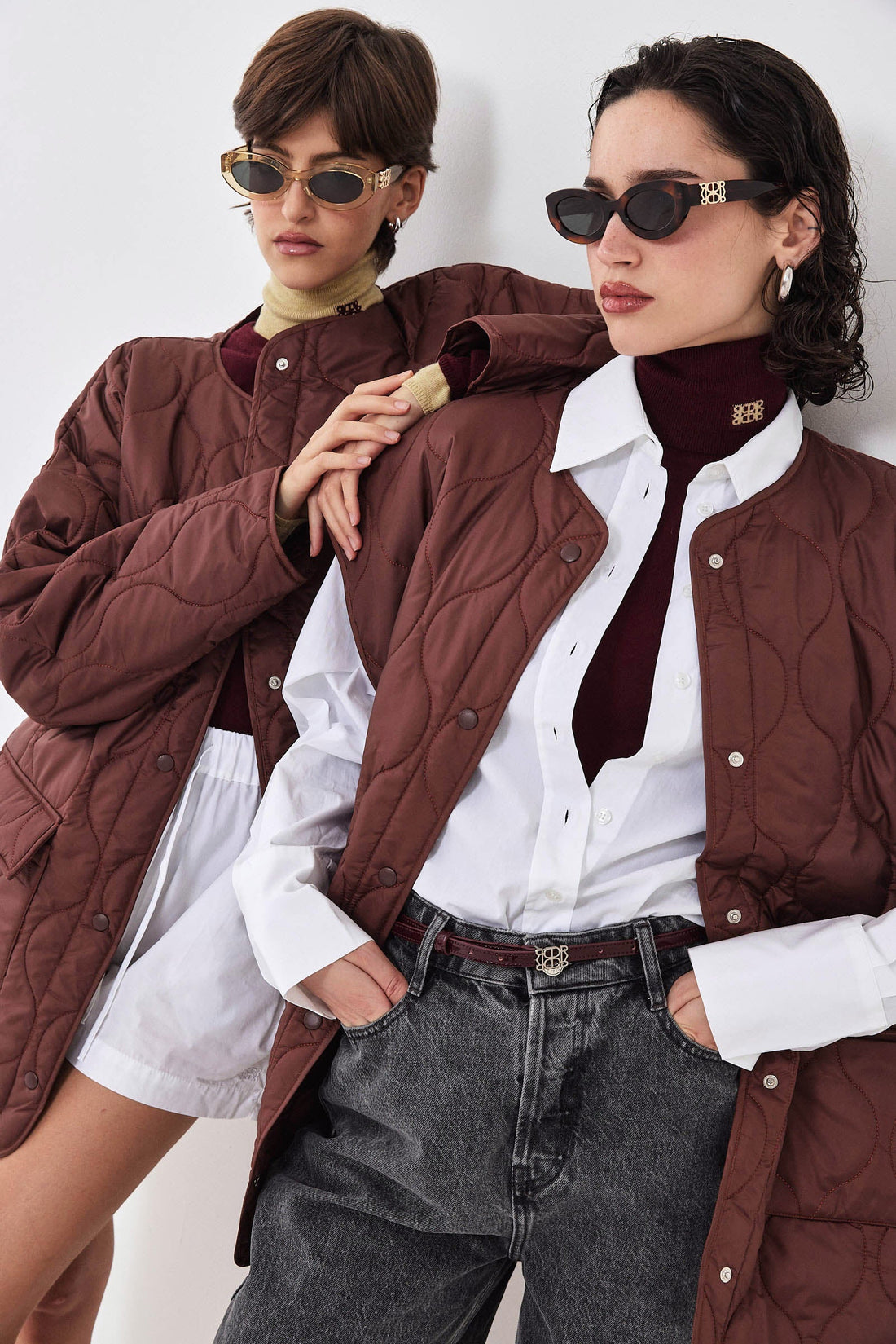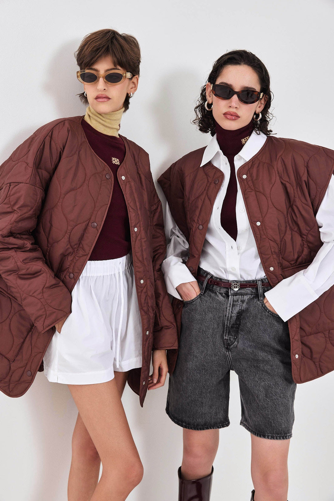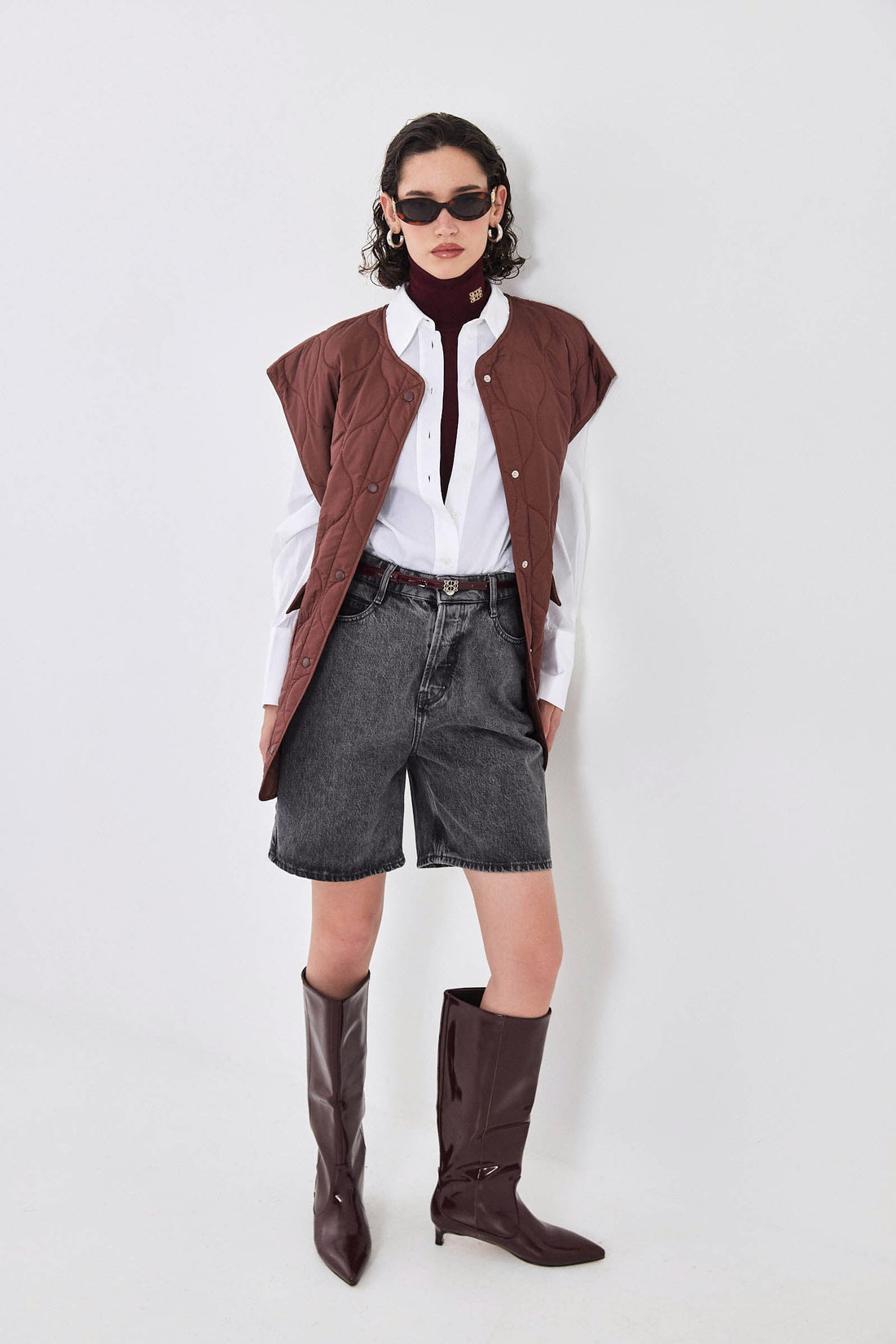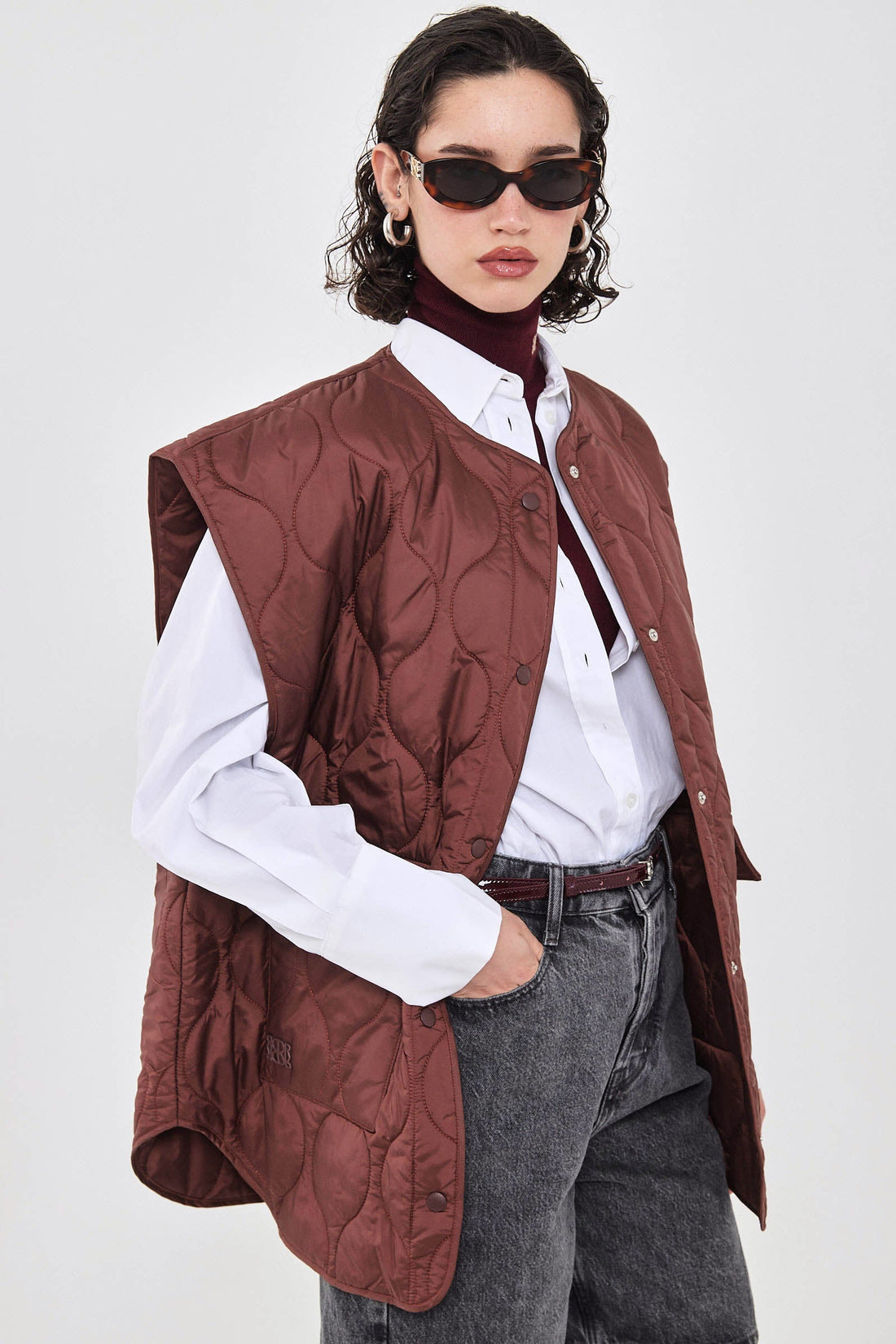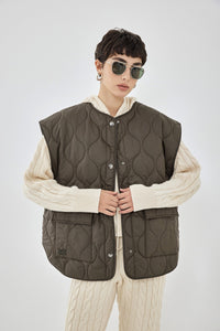 An ultra-chic addition to your winter wardrobe. Quilted lightweight vest. Onion quilt pattern. Unlined. Features engraved snap buttons closure. Oversize fit. Two front pockets with a snap button closure. Luxurious tonal metal logo placed on the side pocket. Style it over our ribbed long sleeved top, a pair of denim and our matching quilted bag for a cool everyday look.