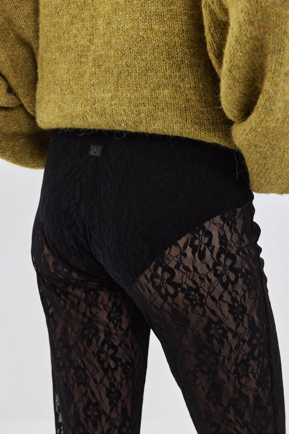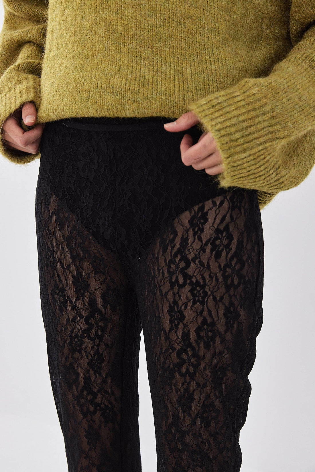 Mid waisted bootcut lace pants. Flowery lace pattern. Stretchy fabric that hugs the body. Full length. Baby lock finish. Style it over lace underwear and a large sweater or oversized tee and kitten heels for a super stylish night out look.