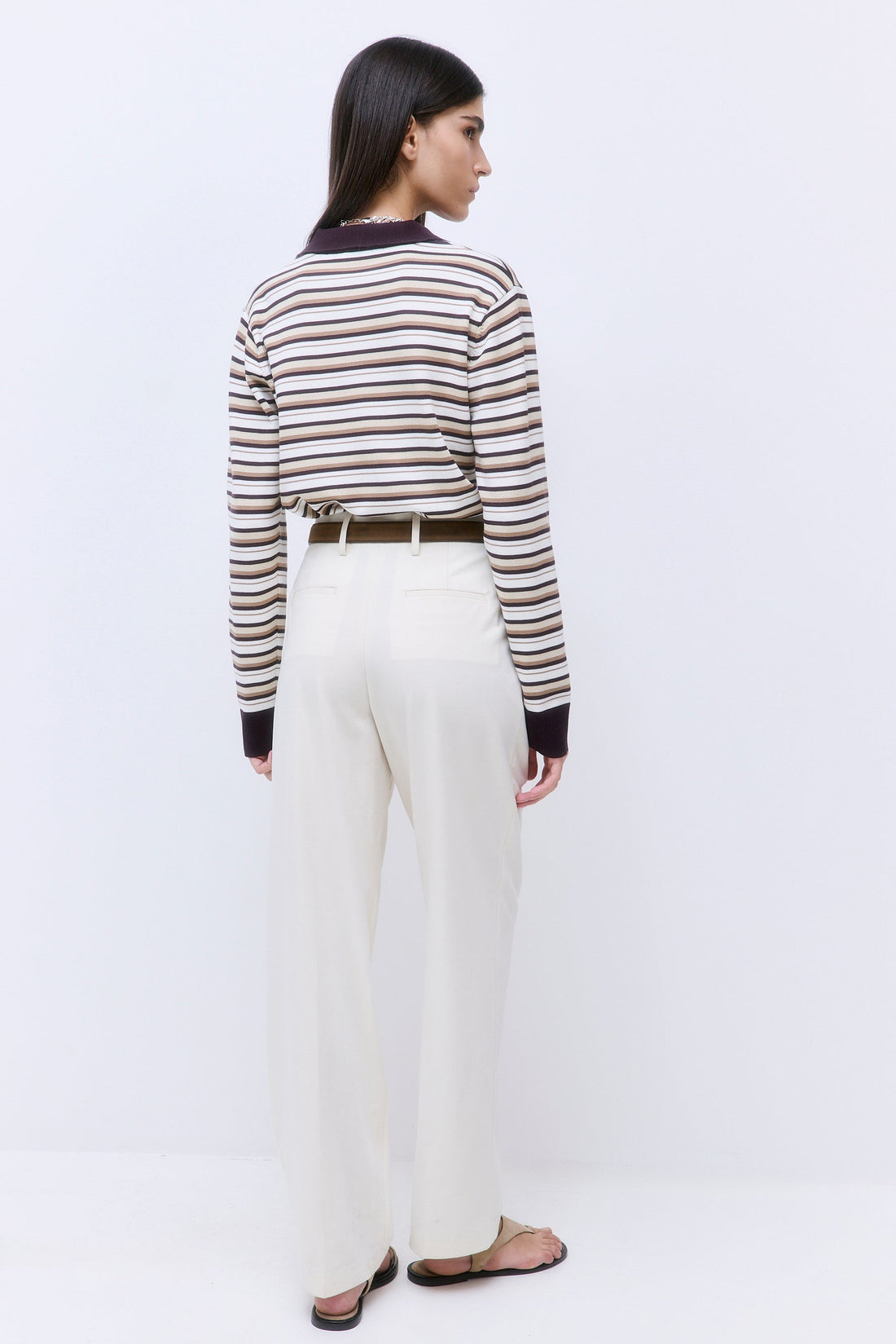 The newest addition to our timeless fully fashioned knitwear. Our new beige stripes polo shirt is a must have this fall. Long sleeved. Four branded buttoned frontal closure. Ribbed finish. Delicate embroidered logo on the front. Classic collar. Style it with our iconic No. 15 Denim and stylish Cateye sunglasses for the ultimate summer to fall look.