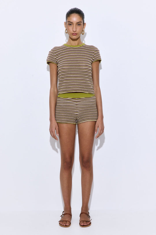 Our new crochet shorts are a true essential this summer. Mid rise. Wide contrasted ribbed waist band. Slightly sheered. Lightweight and breathable luxurious fabric. Ribbed finish. Style it woth our new matching crochet strapless top, our thin crochet scarf and our suede Yvon bag for the ultimate summer look.