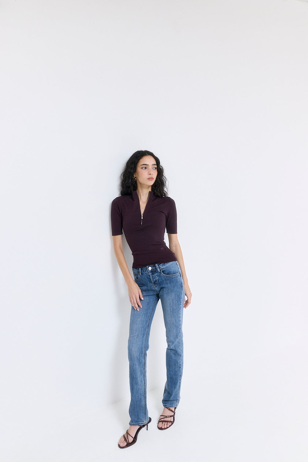 Get ready to fall in love with our new zipper knit. Mid sleeved. Soft body hugging fabric. Fitted silhouette. Tonal logo embroidered on the side. Branded metallic half way front zipper. Clean finish. Delicate ribbed collar. Style it with our perfect pair of denim, oval sunglasses and our iconic Yvon shoulder bag.