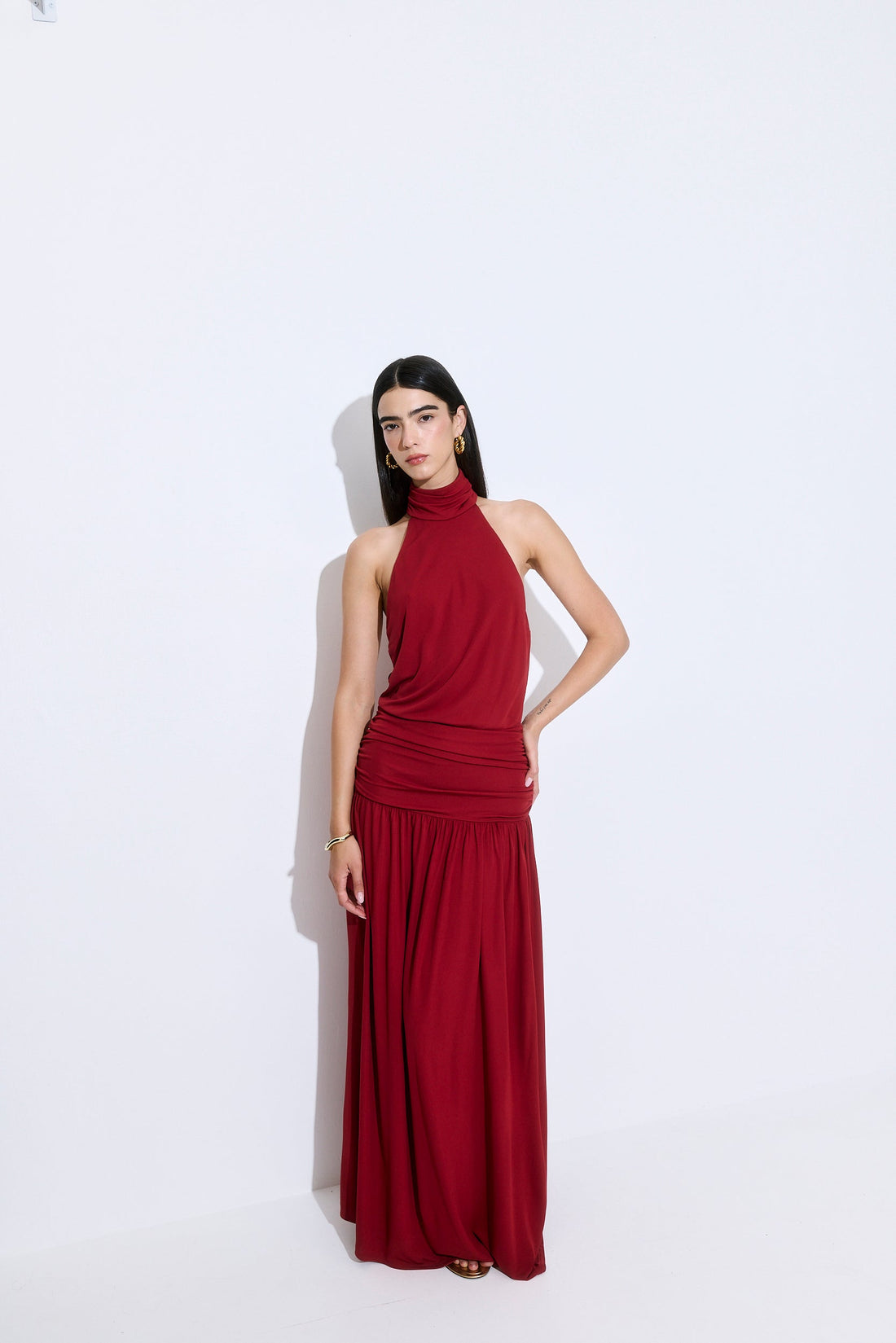 The newest addition to our signature eveningwear line, crafted in stretchy and soft fabric that flatters and shapes the body. A draped halter-neck maxi dress with an elegant high neckline and an open back. Button closure at back of the collar. Gathered detailing at the waist for a flattering silhouette. Maxi-length hemline for a graceful, elongated effect. Slip-on style with a relaxed fit through the skirt. Style it with our new beautiful leather Yvon bag for the most perfect occasion outfit.