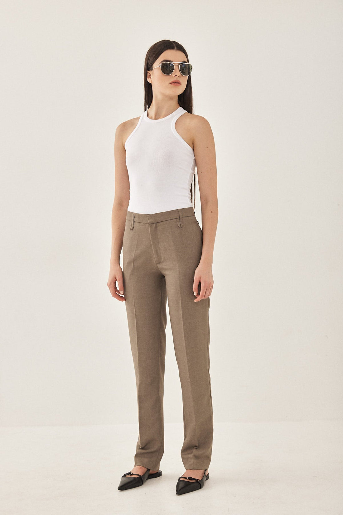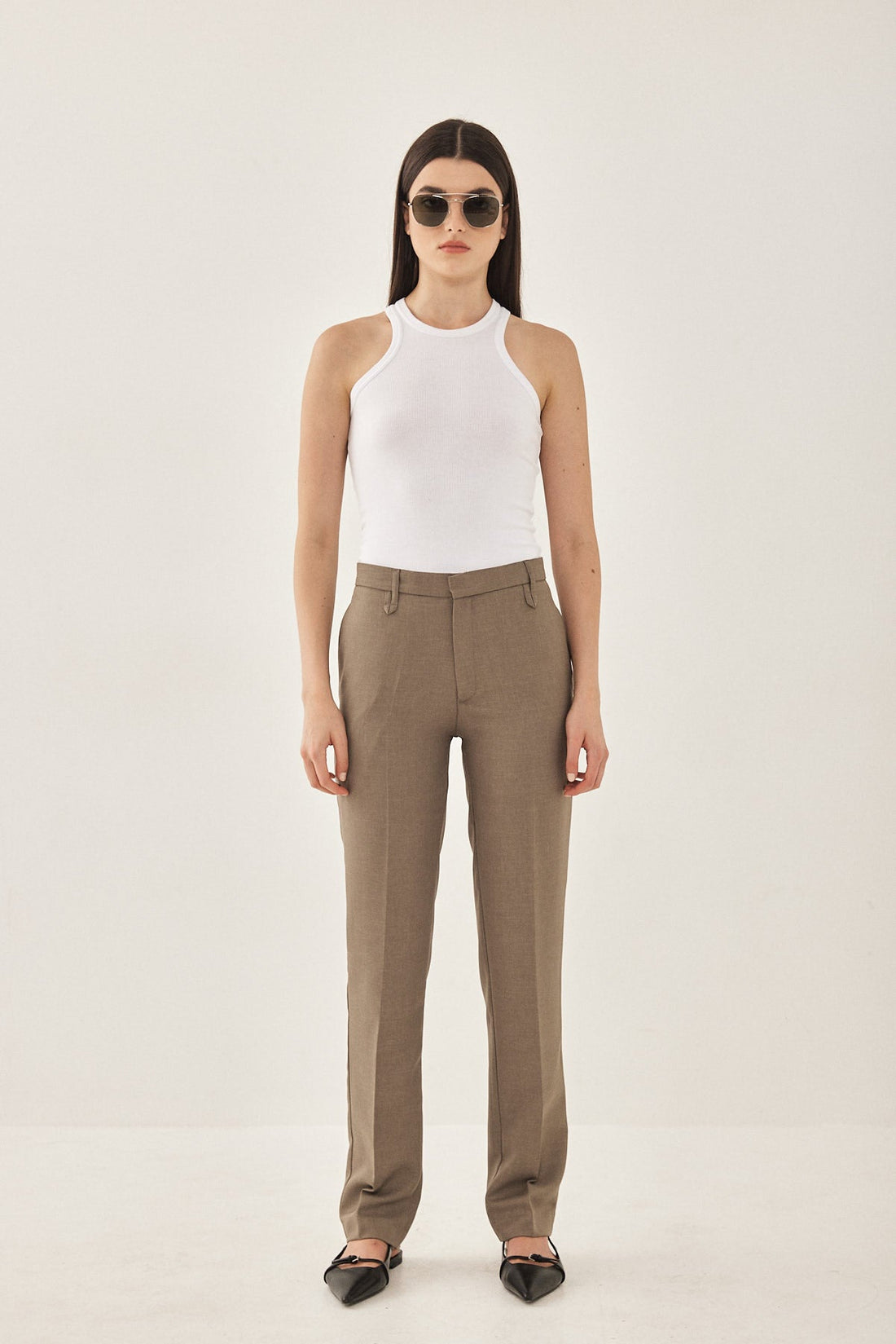 Straight fit mid rise tailored pants. Featuring side pockets, front pleat detail, belt loops and front metal hook and zip closure. Printed logo across inner belt. Wear yours with a basic top and matching Daddy blazer.