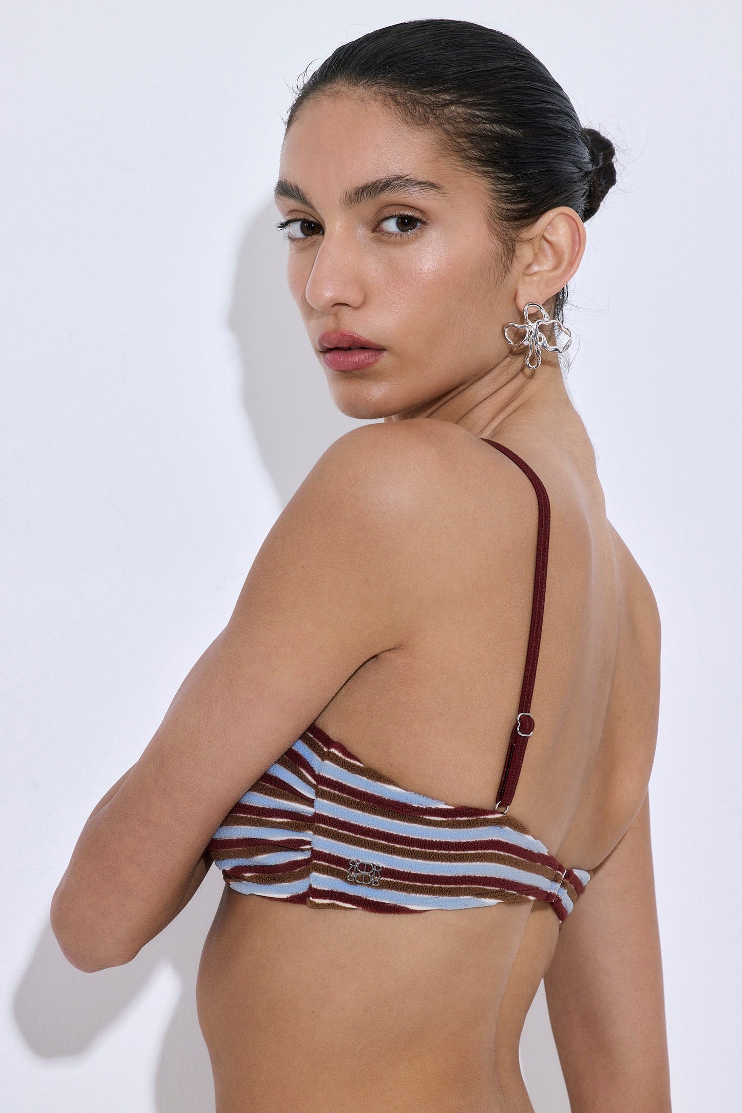 Iris, inspired by the delicate yet resilient water flower, is the perfect blend of minimalism and elegance. Featuring a vintage-inspired striped pattern for a timeless, retro look. Made from ultra-soft towel fabric that sculpts and supports your body with a sleek, second-skin fit. A modern, straight-across bandeau silhouette with thin, adjustable shoulder straps for a barely-there feel and customizable support. Features a silver metallic logo detailing on the back side. Lined. Logo engraved clasp back closure. Preparation for cup inserts (no cups provided). Style it with our Maia bottom, our new linen full length pants and our crochet bucket hat to seal this gorgeous look.