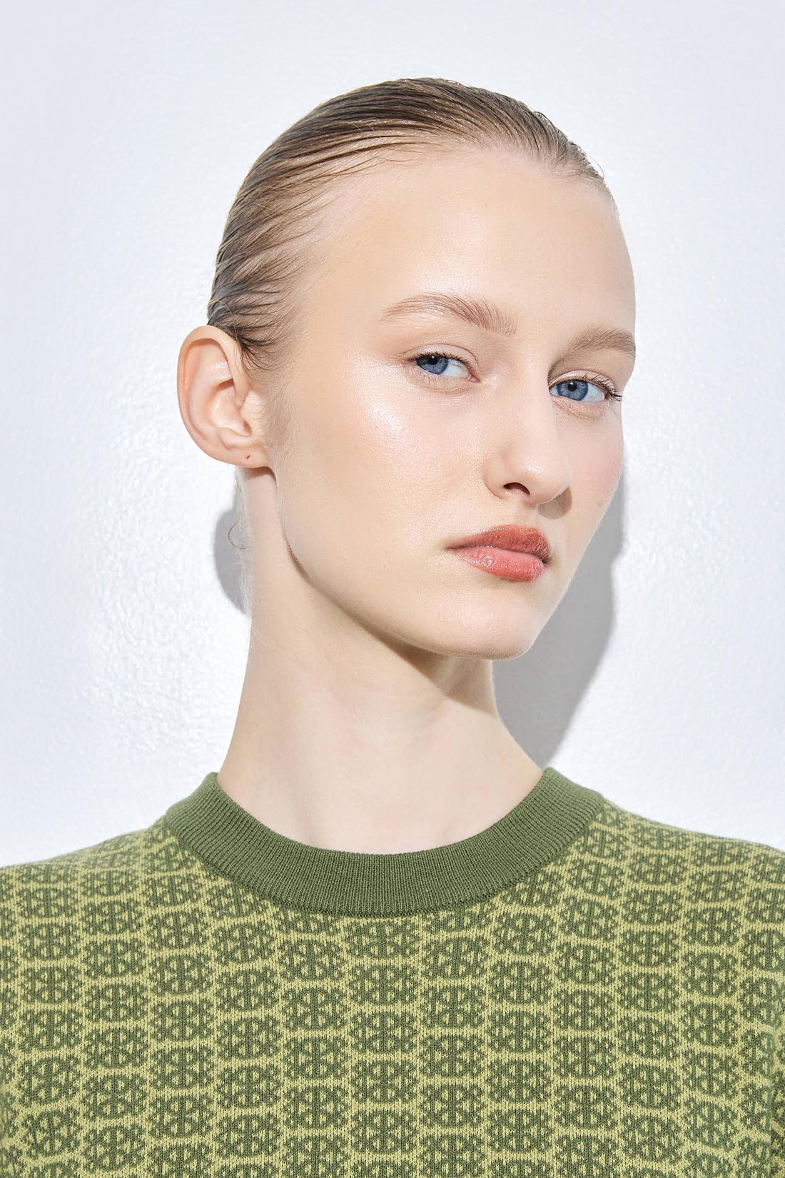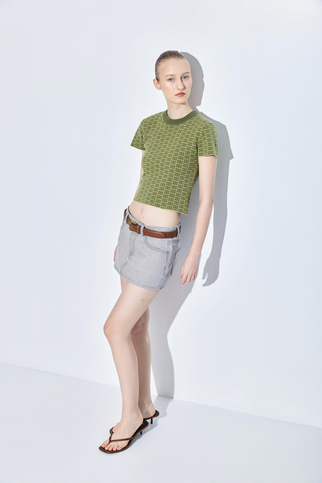 An essential staple with a luxe twist. Our new monogram baby tee features a ribbed crew neckline and an all-over contrasting monogram intarsia logo. Crafted in a soft knit, it's designed to flatter while making a statement. Style it with our beautiful linen pants, a pair of our oval sunglasses and our cool scrunchie for an everyday summer look.