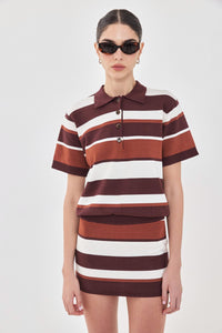 The newest addition to our timeless fully fashioned knitwear, our new striped burgundy polo shirt is a must have this fall. Short sleeved. Four branded buttoned frontal closure. Ribbed finish. Delicate embroidered logo on the front. Classic collar. Style it with a high waisted wide leg denim and a wide buckled belt for a chic vintage inspired everyday look.