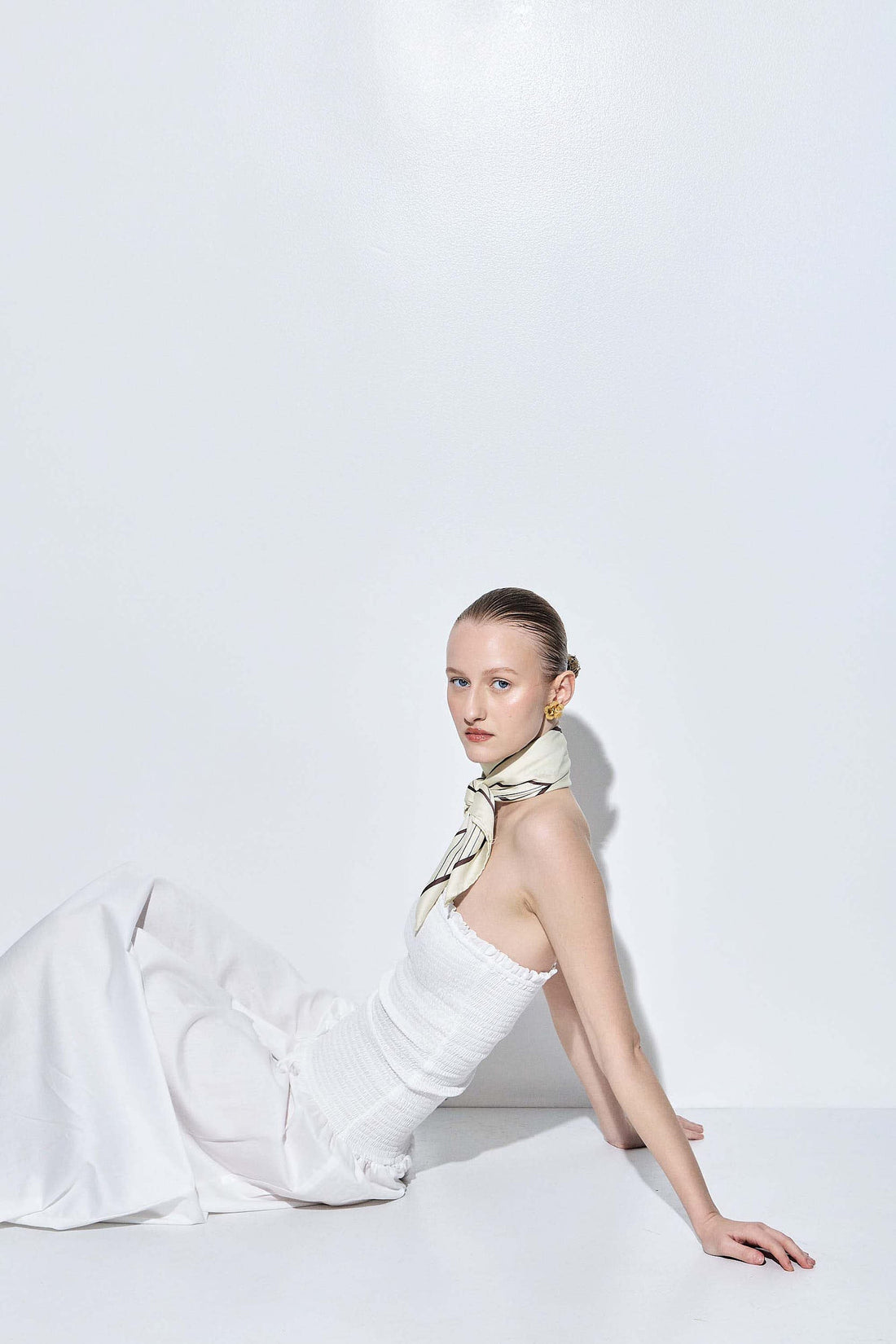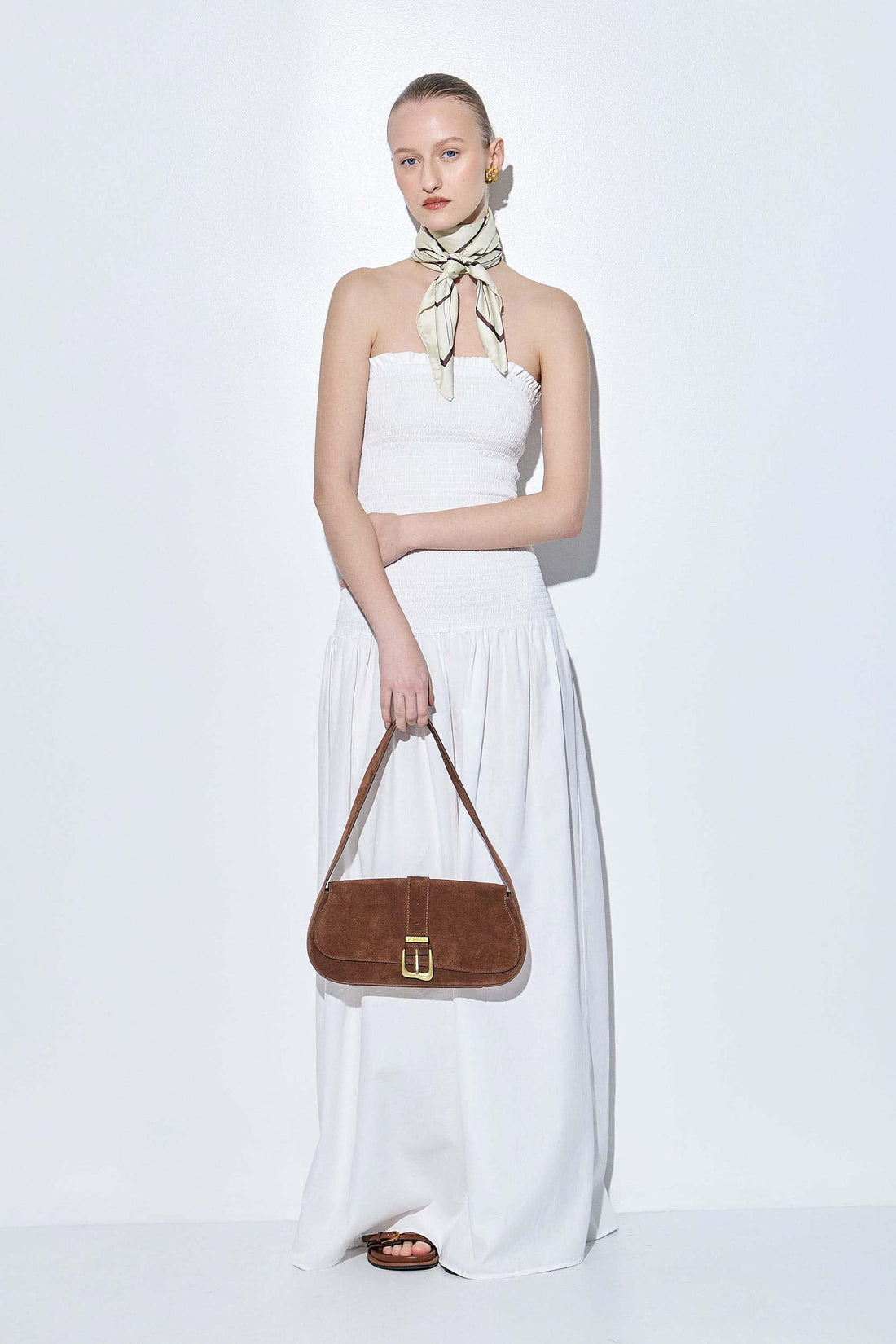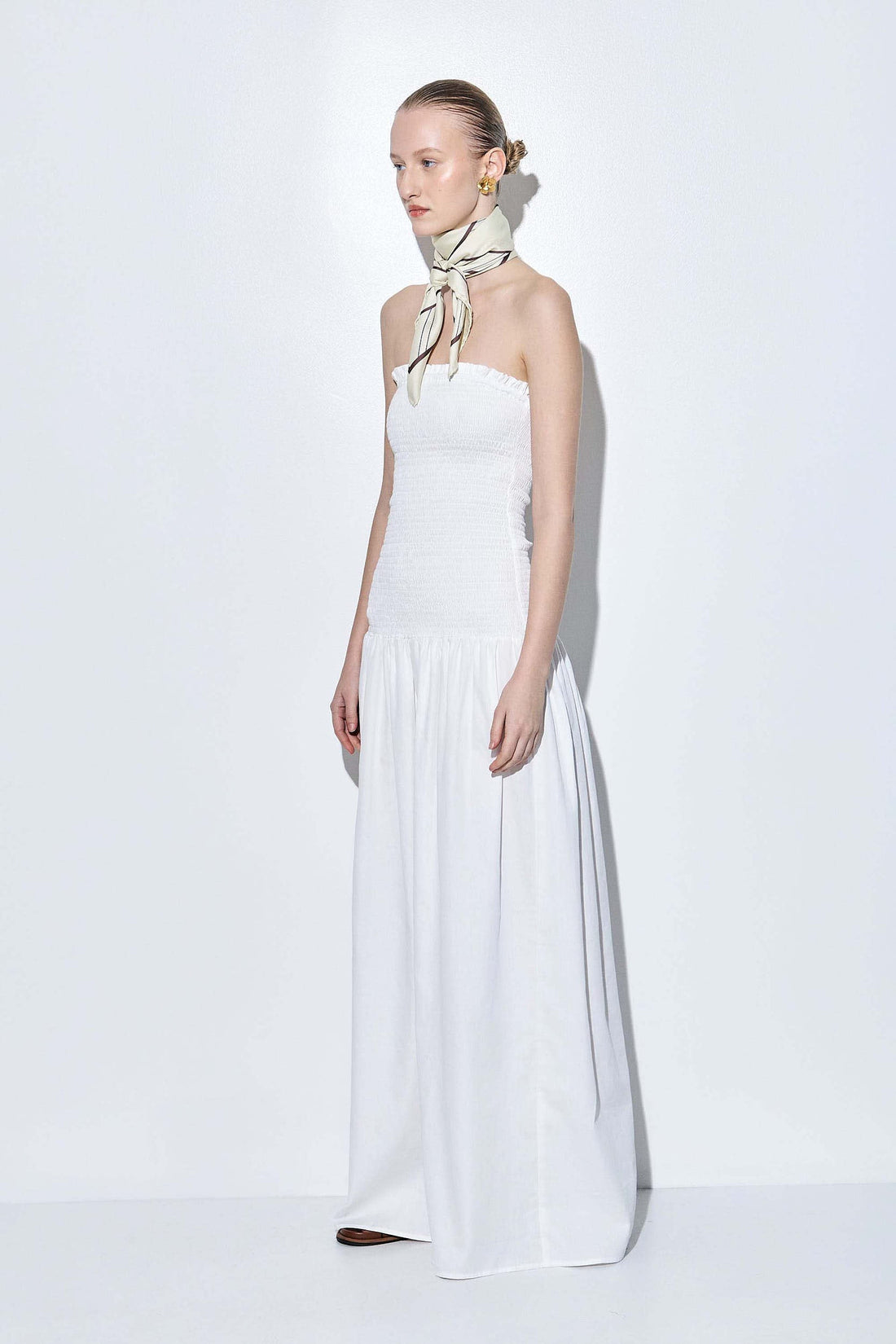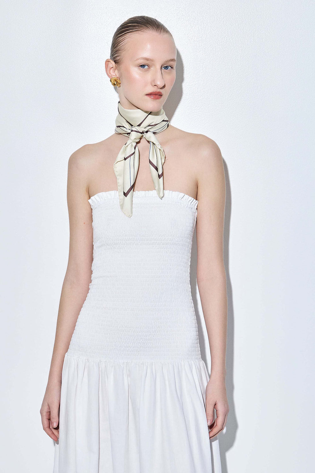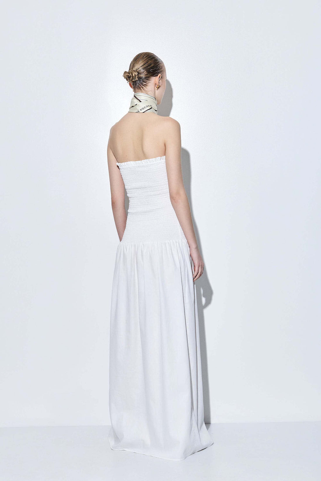 Our new shirred strapless maxi dress is the perfect addition to your summer wardrobe. Featuring a flattering shirred bodice that hugs the body and a flowy, voluminous silhouette from the waist down. Made from lightweight, breathable cotton for an airy feel. Strapless design with an elasticated top for a secure and comfortable fit. Maxi length. Pair it with our monogram printed scarf and our beautiful oval sunglasses for a chic everyday look.