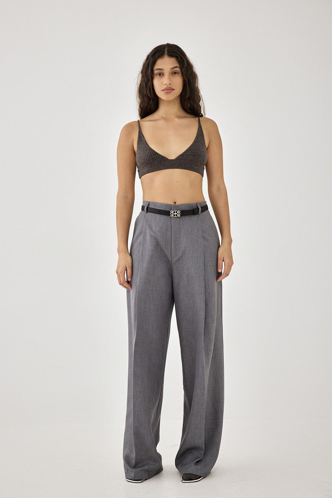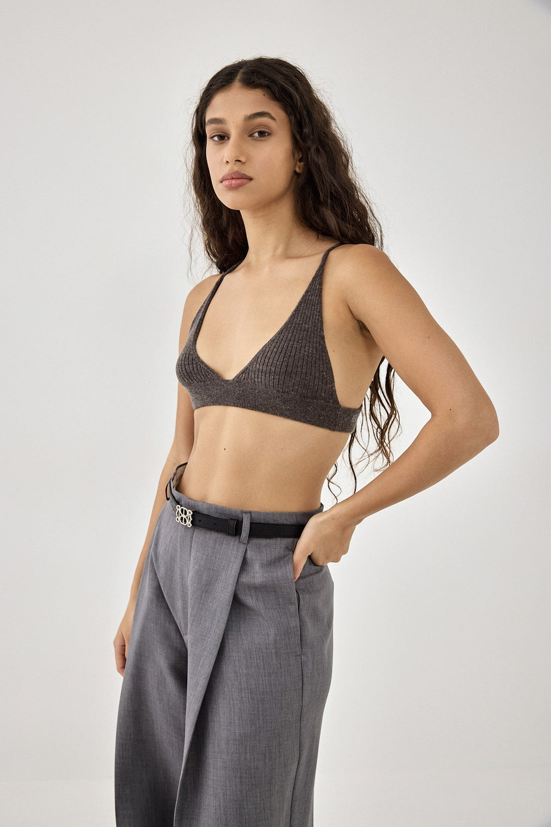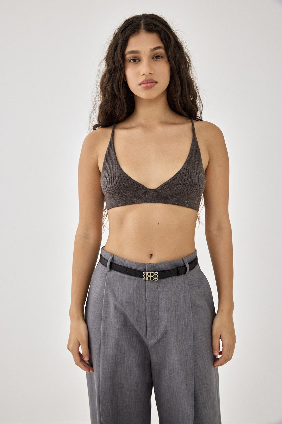 The coziest bralette you'll own. Triangle bralette. Ribbed material. Thin straps. Elastic underbust band. Logo embroidery detailing at the back of the band. Style it with the matching cozy panties, throw the cozy cardigan on top and get ready to bundle up in the coziest set.