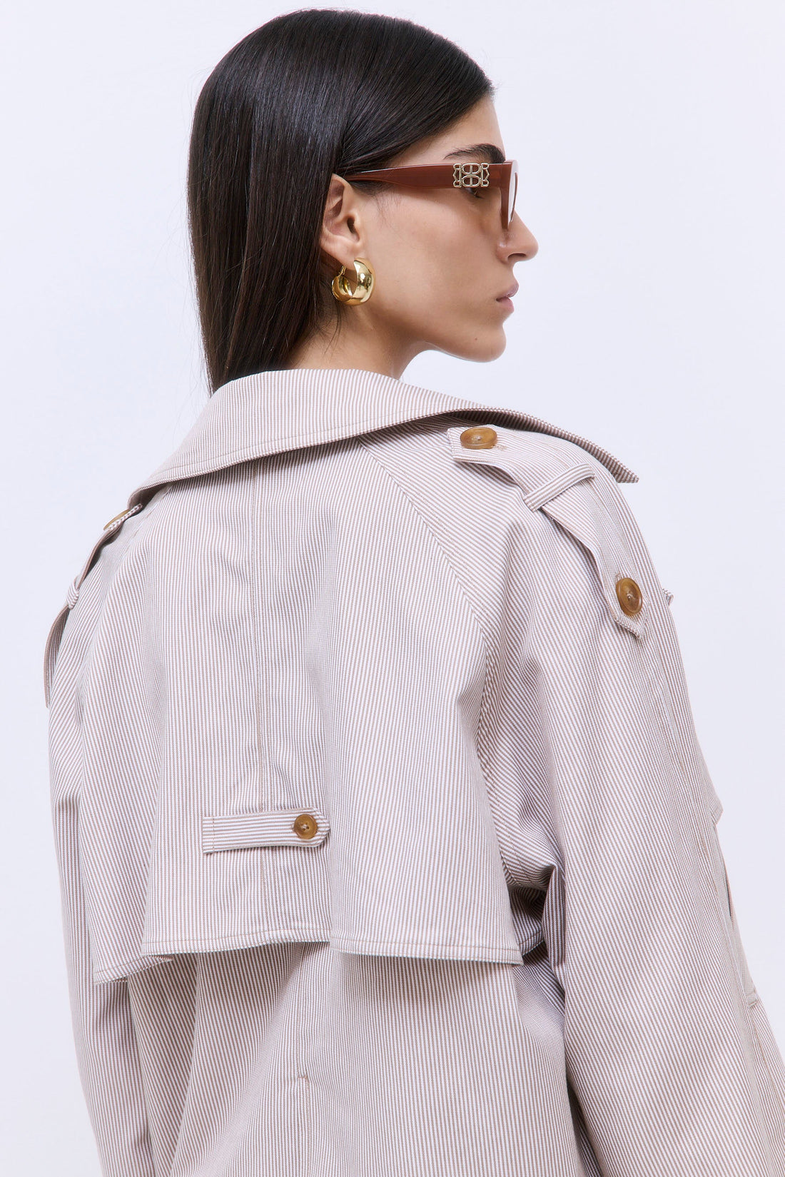 A modern take on the classic trench coat. Cropped. Double-breasted silhouette. Front and back flaps for structured finish. Featuring tonal embroidered logo. Contrasting logo engraved button closure. Fully lined. Epualettes. Cuff straps. Side pockets for comfort. Style it with our new matching Striped Drill Pants and timeless Aviator sunglasses for a chic fall look.