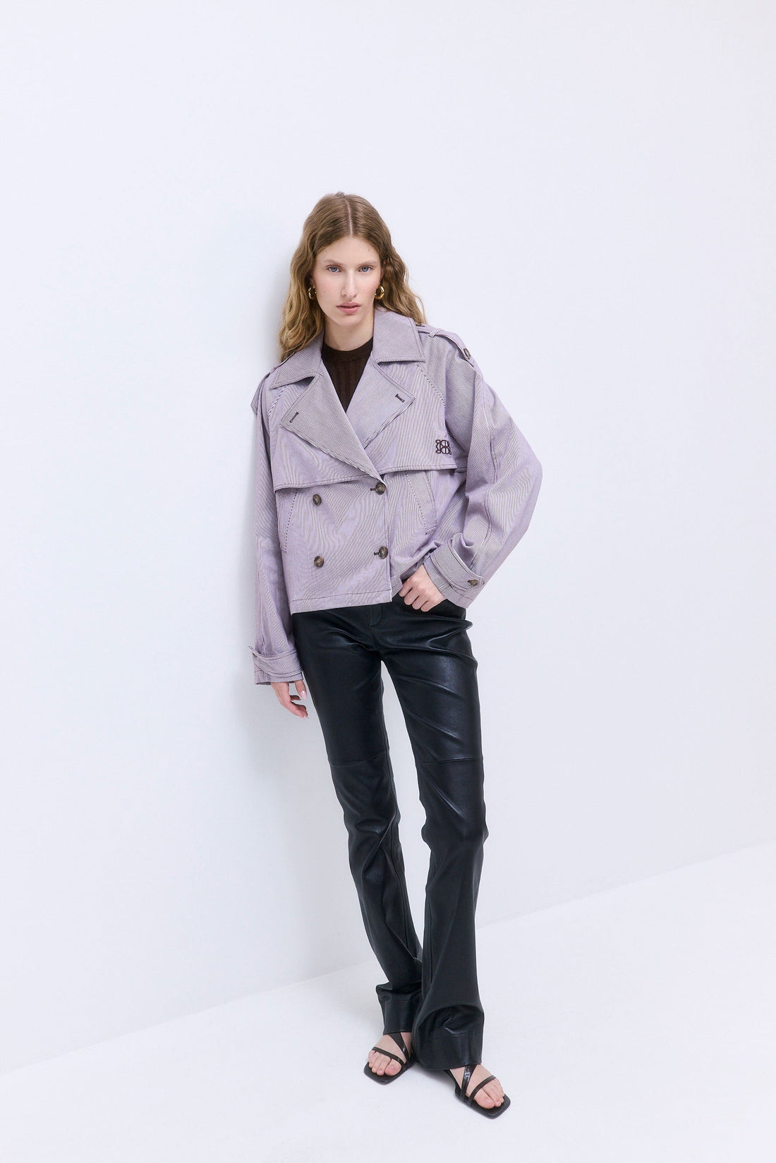 A modern take on the classic trench coat. Cropped. Double-breasted silhouette. Front and back flaps for structured finish. Featuring tonal embroidered logo. Contrasting logo engraved button closure. Fully lined. Epualettes. Cuff straps. Side pockets for comfort. Style it with our new matching Striped Drill Pants and timeless Aviator sunglasses for a chic fall look.