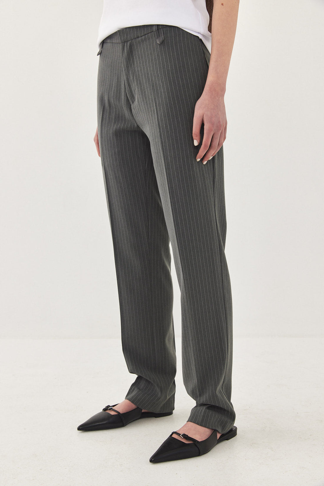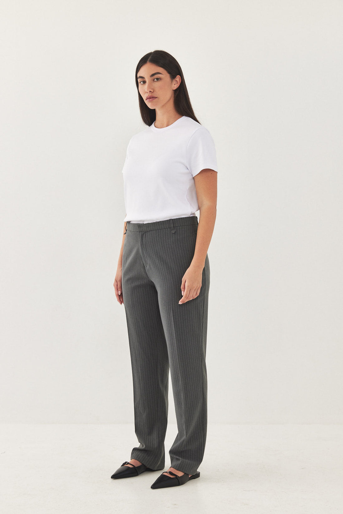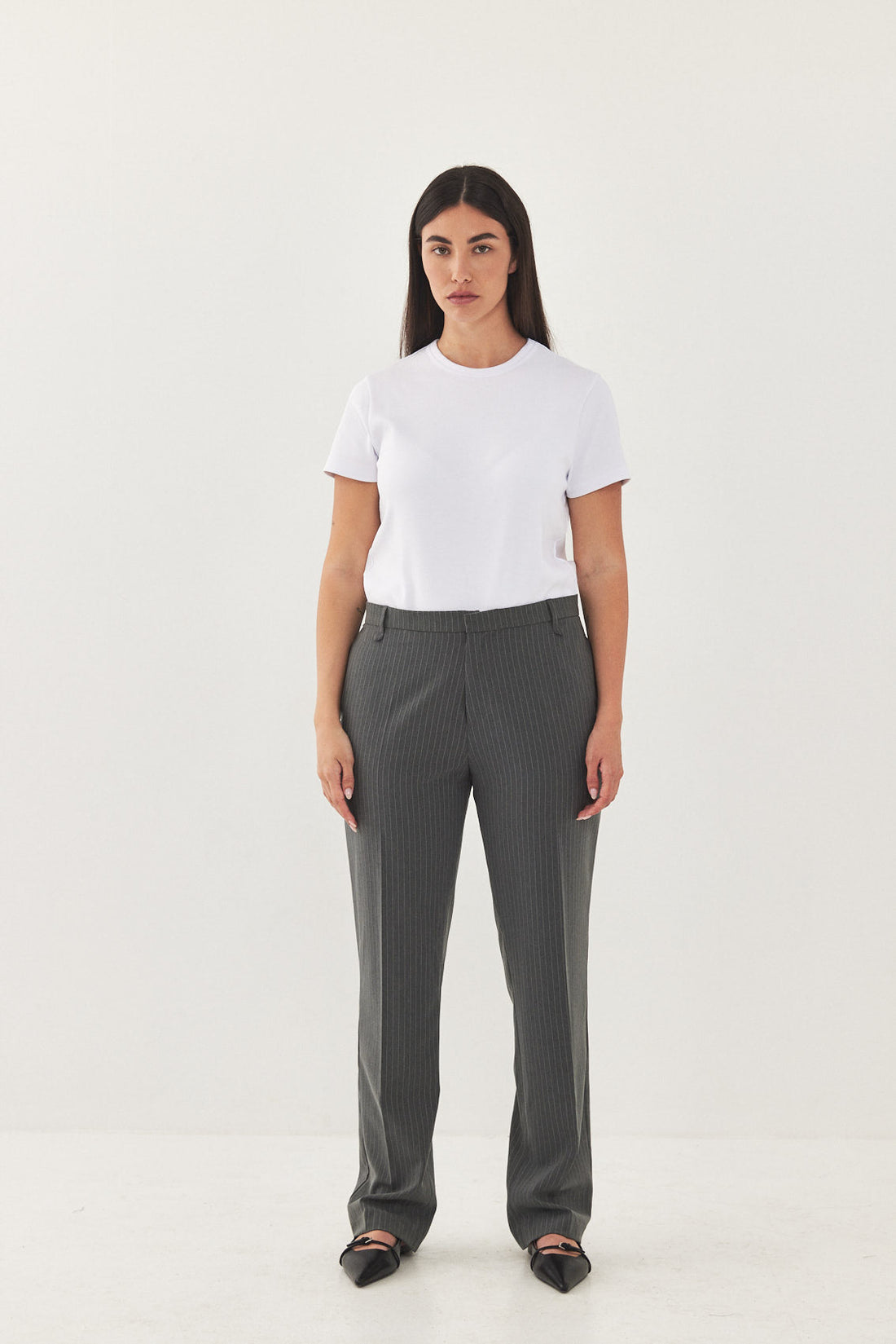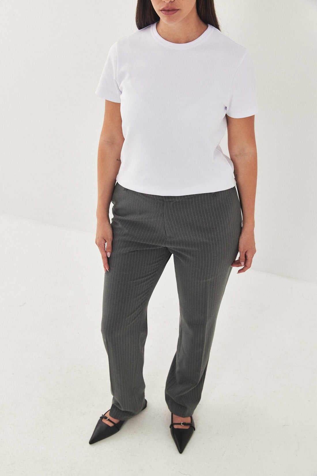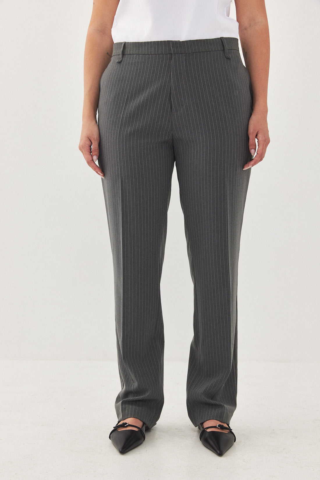 Straight fit mid rise tailored pants. Featuring side pockets, front pleat detail, belt loops and a front metal hook and zip closure. Printed logo across inner belt. Style yours with a basic top and a matching daddy blazer.