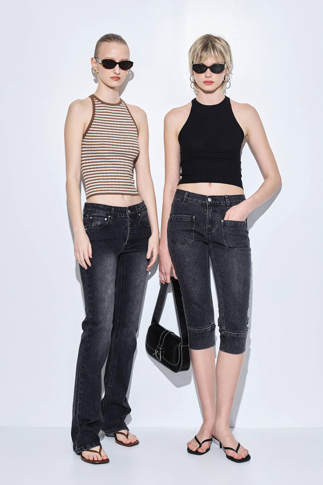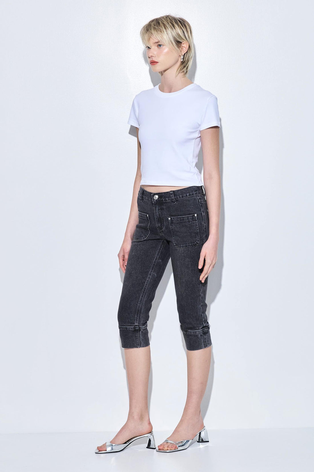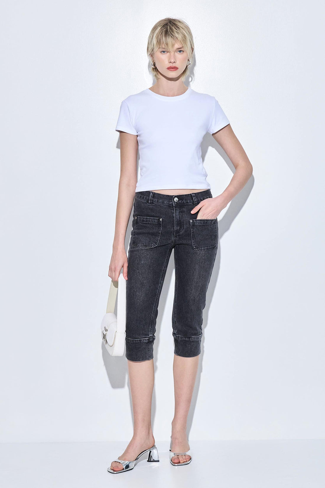 The coolest item in our stretchy denim collection, bring back 90's chic. Knee length. Mid rise. Wide cuffed finish. Two front and back pockets. Tonal logo embroidered on the back. Stretchy fabric. Belt loops. Zipper closure. Style it with our new baby tee, our oval sunnies and throw a vegan leather jacket on top for the coolest look ever.