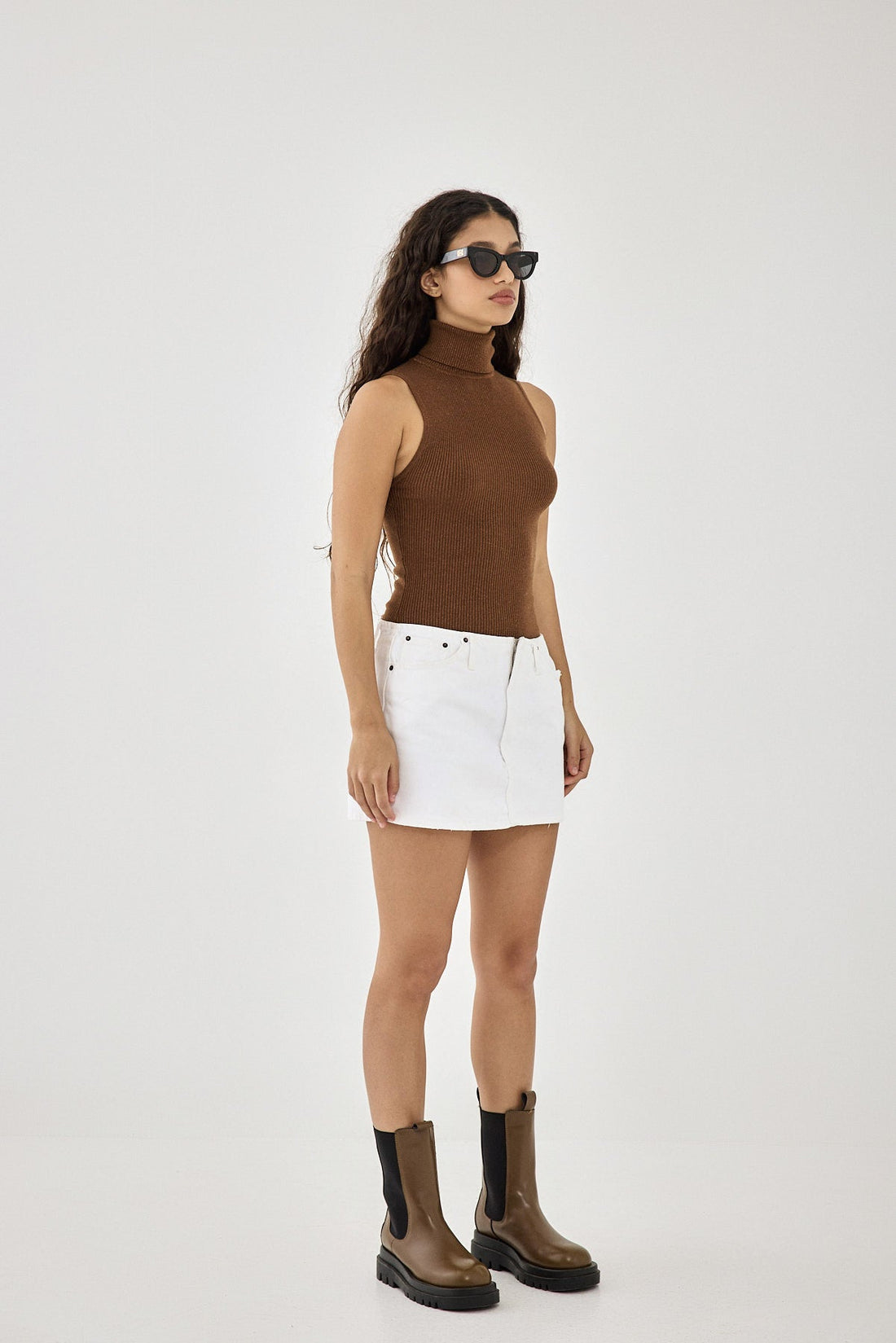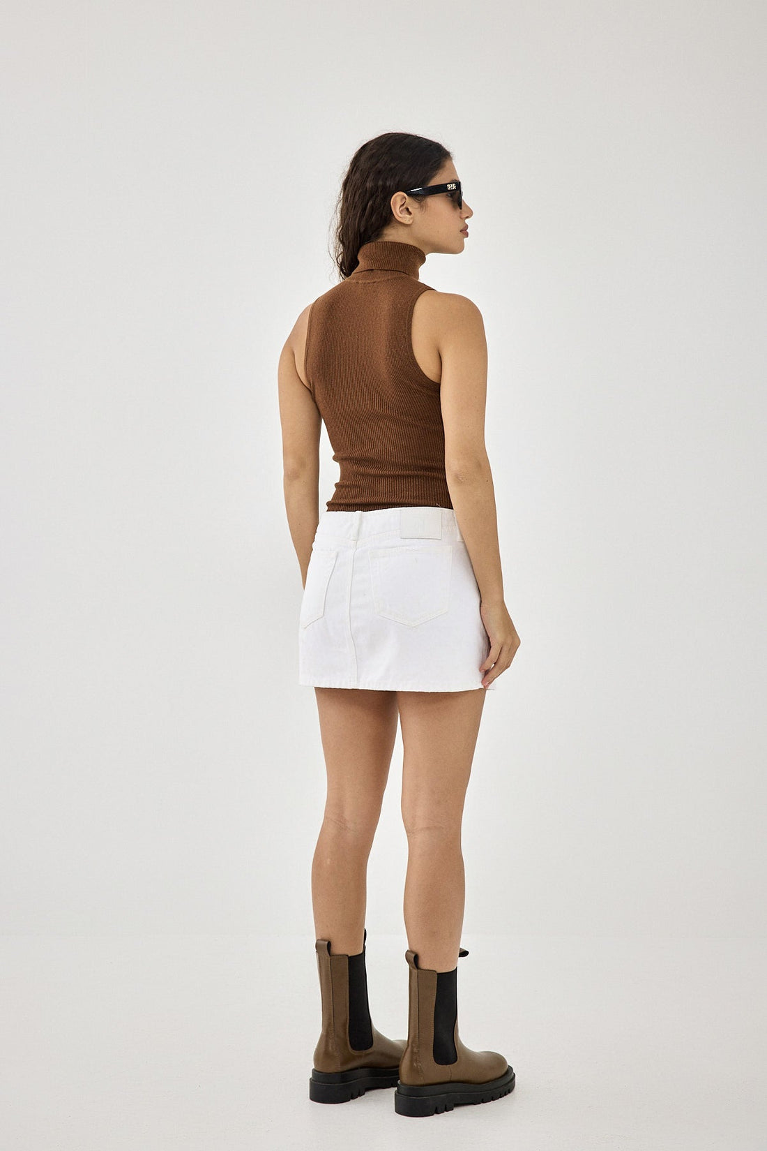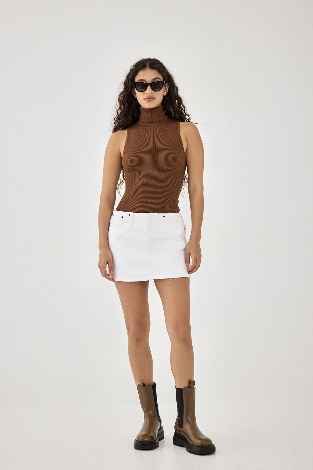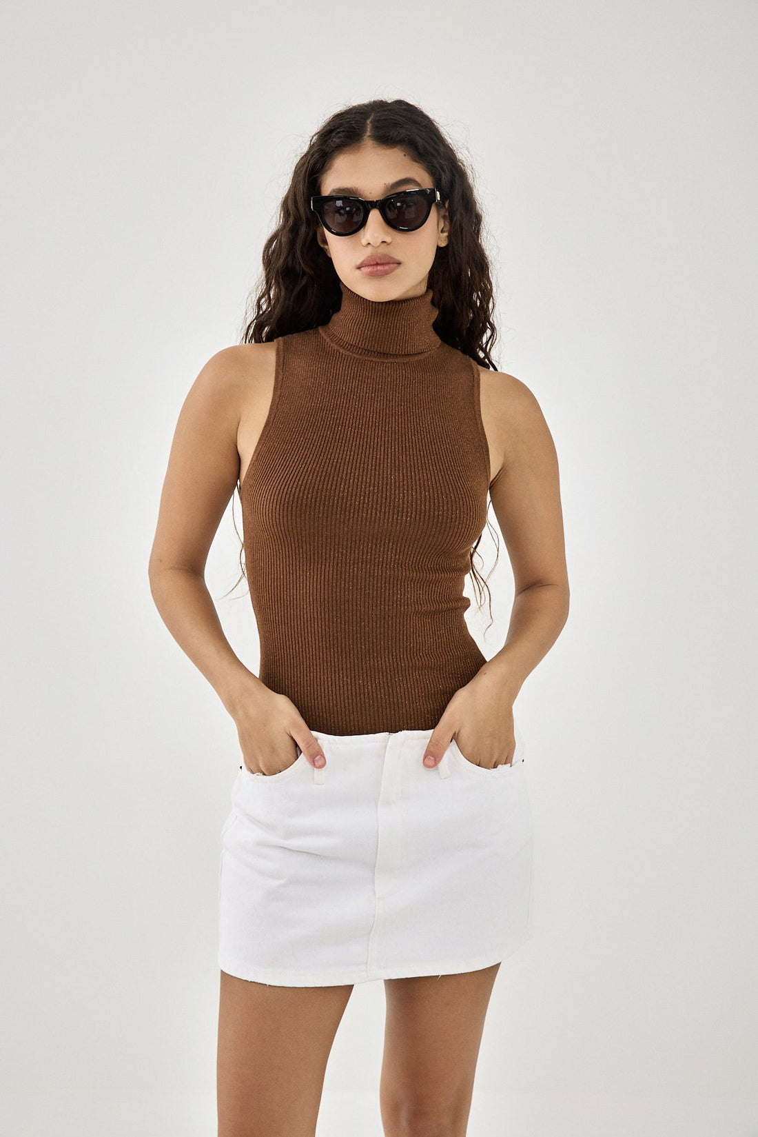 Glitter ribbed turtleneck top. Sleeveless. Material that hugs the body. Slight shine and shimmer within the fabric. Style it with our classic tapered daddy trousers, aviator sunnies and a silver kitten heel for a look both a showstopper but also perfect for everyday.