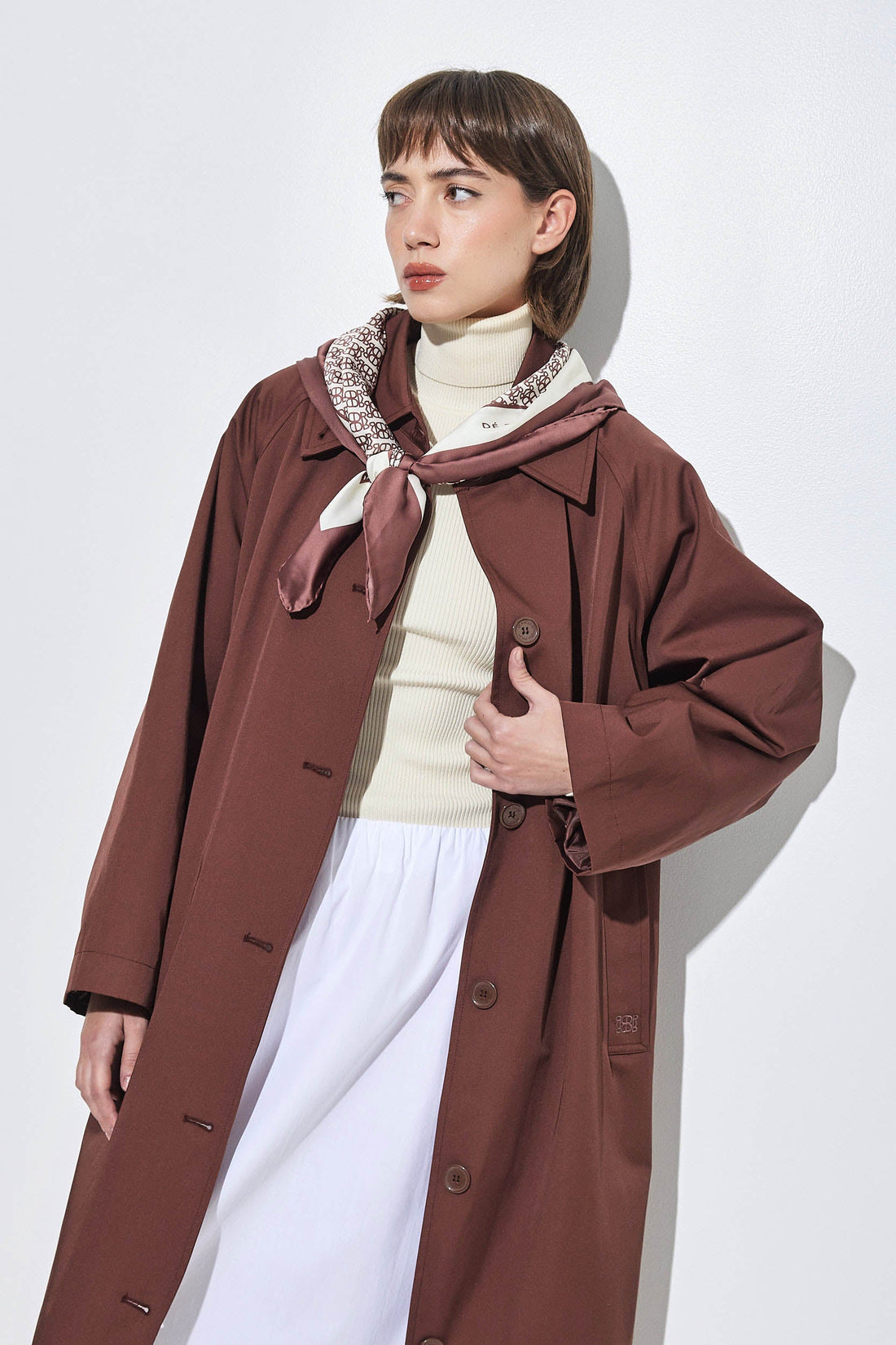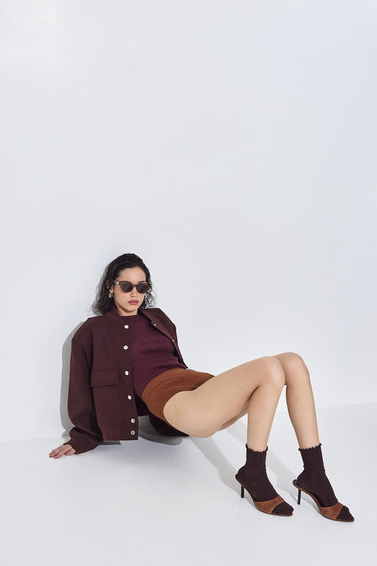Upgrade your winter wardrobe with our luxurious scarf. Designed for a silky smooth feel in a rich burgundy hue. Featuring a screen-printed design, subtle framing and an invisible finish. It's the perfect chic accessory for chilly days. Style it with our long sleeved ribbed knit, a pair of our new denim, our DR croco belt and throw a vegan leather bomber on top to seal this cool look.
