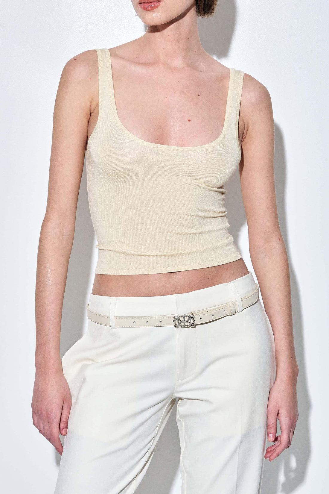 Our new knitted tank top is the perfect pick for this season. Features a scoop neckline and wide straps. Crafted from a soft, breathable knit fabric with a close-to-body fit for a sleek silhouette. Fully fashioned. Thin ribbed finish. Style it with our new buckle maxi skirt for a stylish set look, for any occasion.
