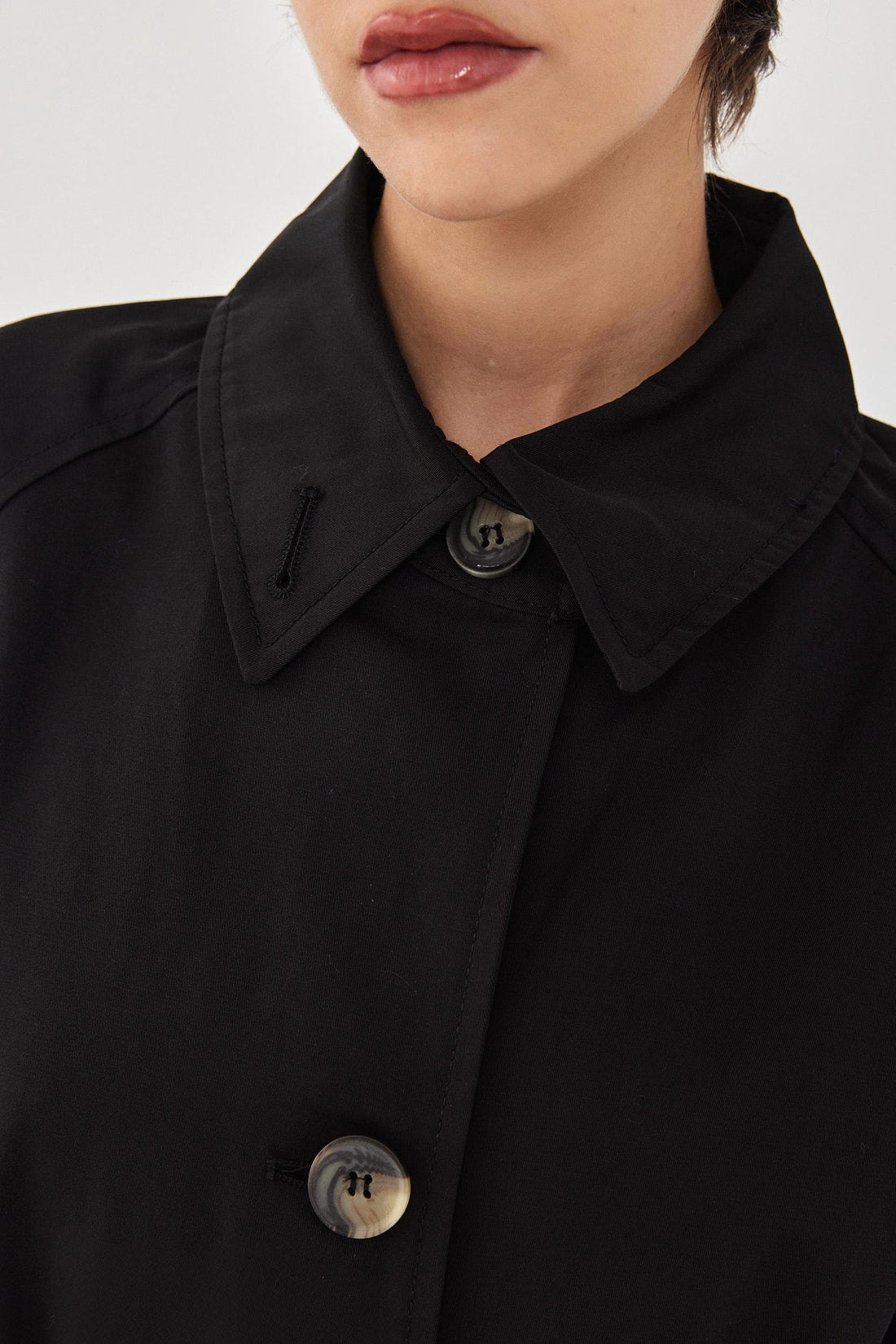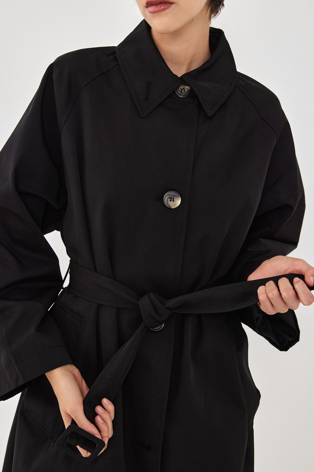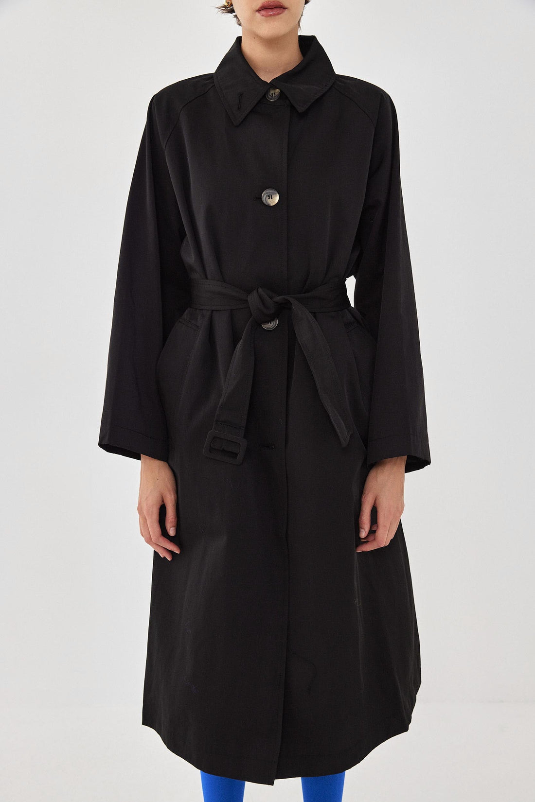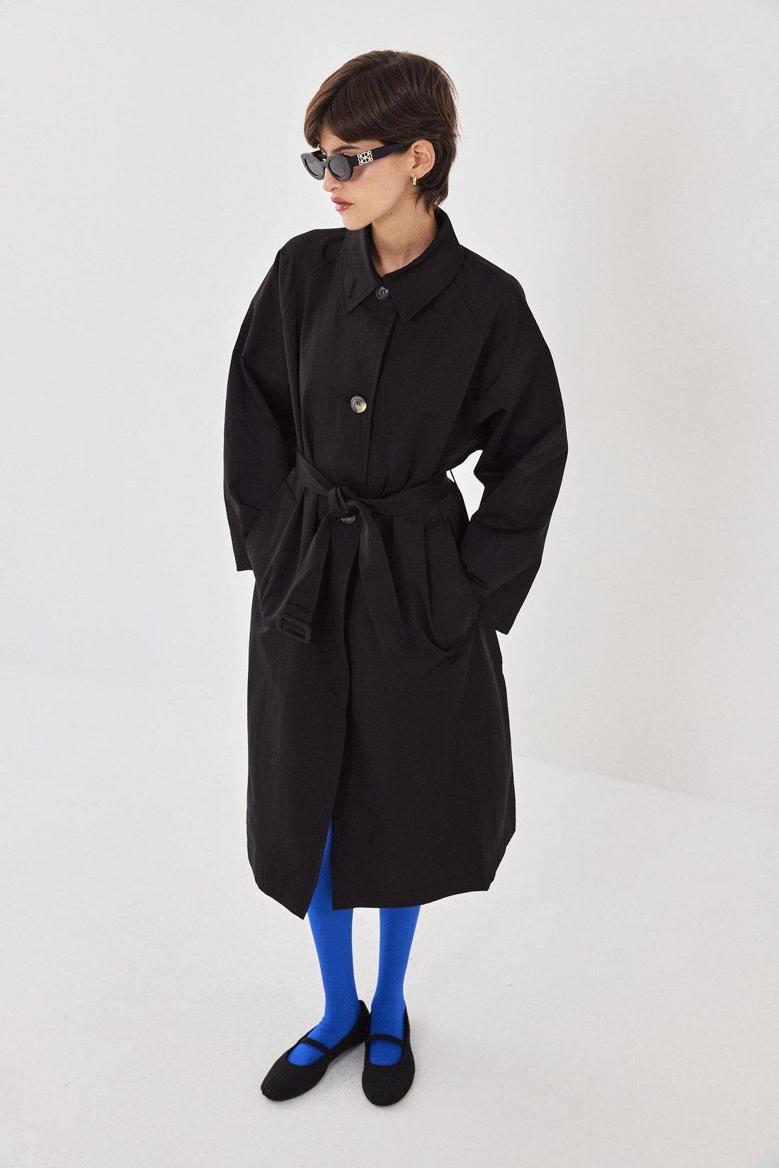 Dé trench coat is made from a lightweight and breathable fabric. A loose fit with long voluminous sleeves and a back vent hem. Sharp pointed collar with button fastening and comes with a self tie waist belt to cinch your waist. Wind and water resistant. Wear yours with absolutely everything, from tailoring to track pants.